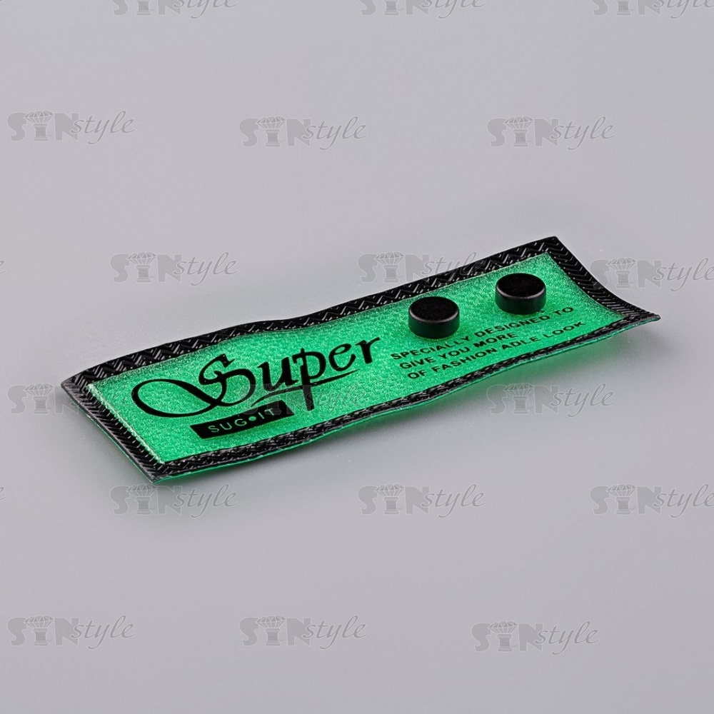 Аппликация пришивная ПВХ, полупрозрачная с надписью и черными заклепками, размер 65x25 мм, цвет зеленый
