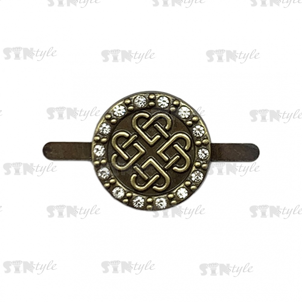 Брошь металлическая, крепление усики, диаметр 18 мм, цвет бронзовый+белые стразы