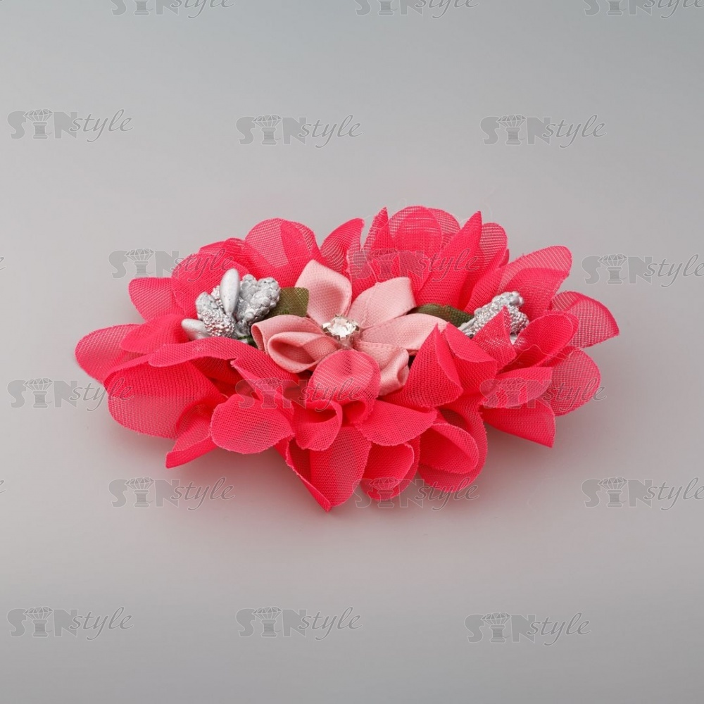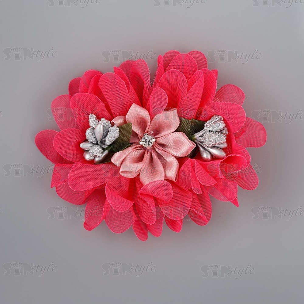 Оригинальный цветок продолговатой формы с сердцевиной в виде цветочной композиции. Тканевые цветы широко применяются как отделочный элемент для платья, блузки, шапочки, косынки, берета, повязки, ободка для волос, резинок, заколок, обуви из текстиля. Так же можно использовать для декорирования букетов, подарочной упаковки, праздничных композиций.