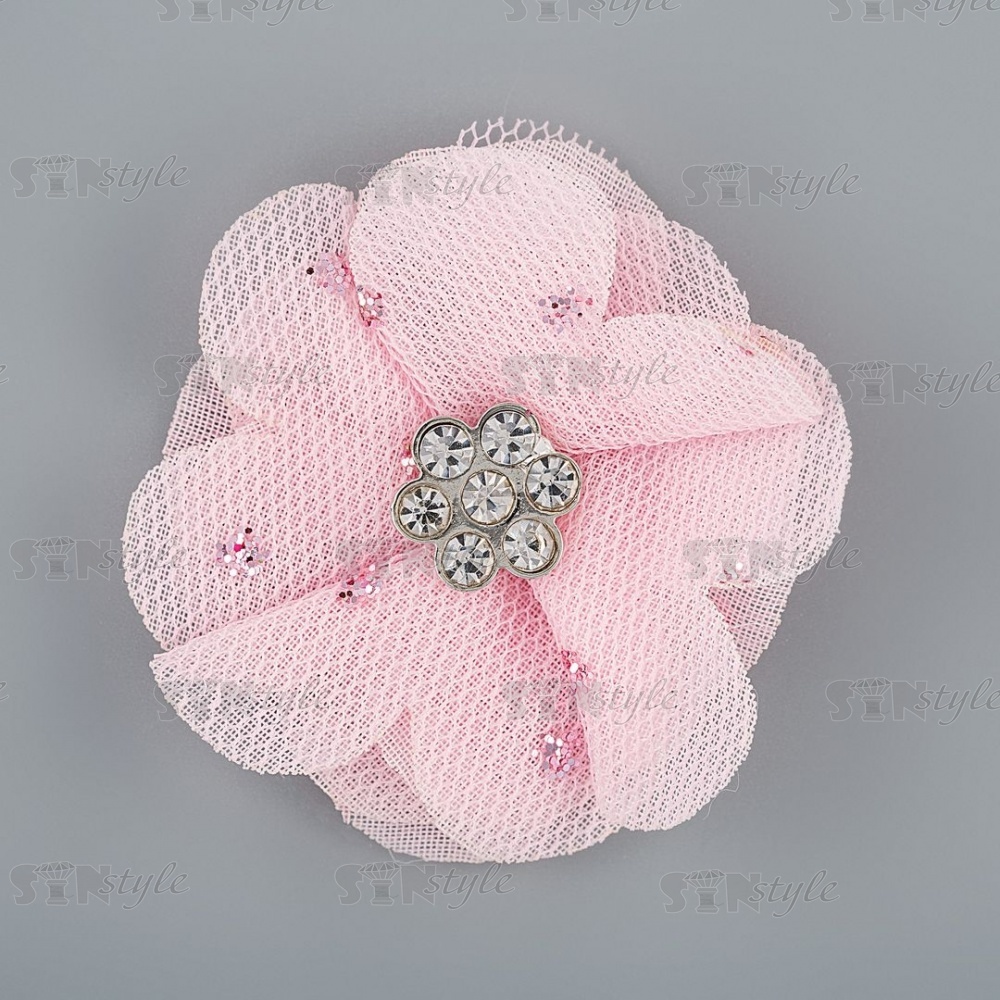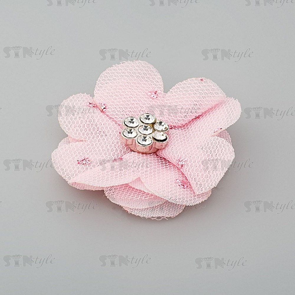 Оригинальный цветок из сетчатой ткани со стразами. Тканевые цветы имеют широкий диапазон применения: как отделочный элемент для платья, блузки, театрального костюма, шапочки, косынки берета, повязки, ободка для волос, резинок, заколок, а так же обуви из текстиля. Также цветок может быть использован в украшении букетов, подарочной упаковки, праздничных композиций и поможет решить любую задачу декорирования.