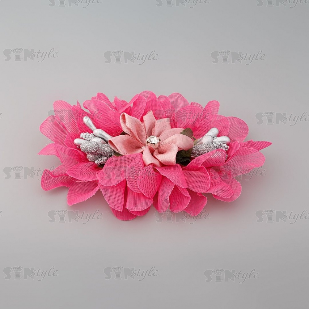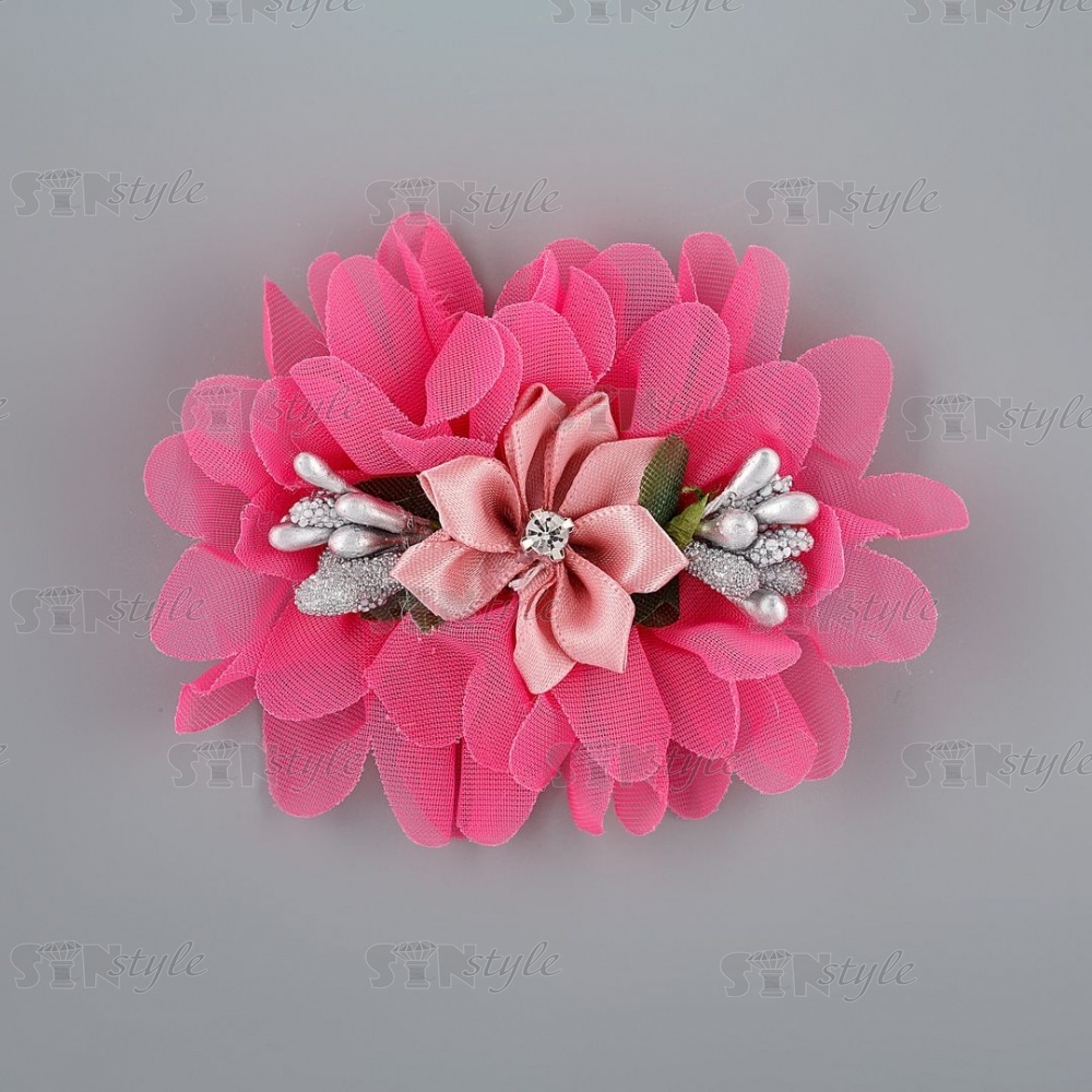 Оригинальный цветок продолговатой формы с сердцевиной в виде цветочной композиции. Тканевые цветы широко применяются как отделочный элемент для платья, блузки, шапочки, косынки, берета, повязки, ободка для волос, резинок, заколок, обуви из текстиля. Так же можно использовать для декорирования букетов, подарочной упаковки, праздничных композиций.