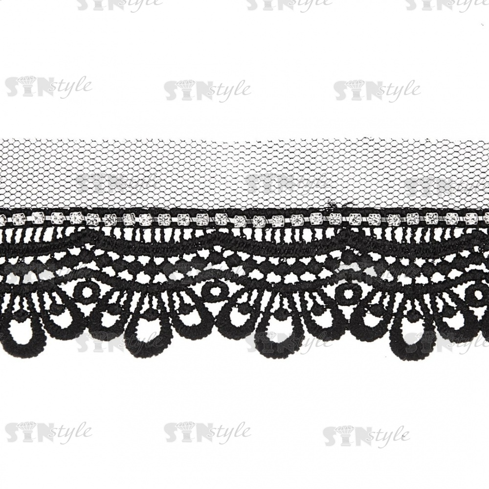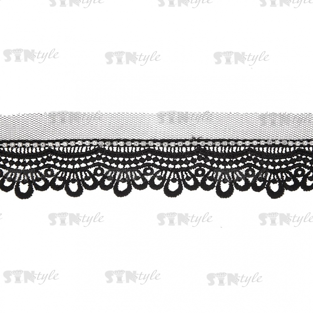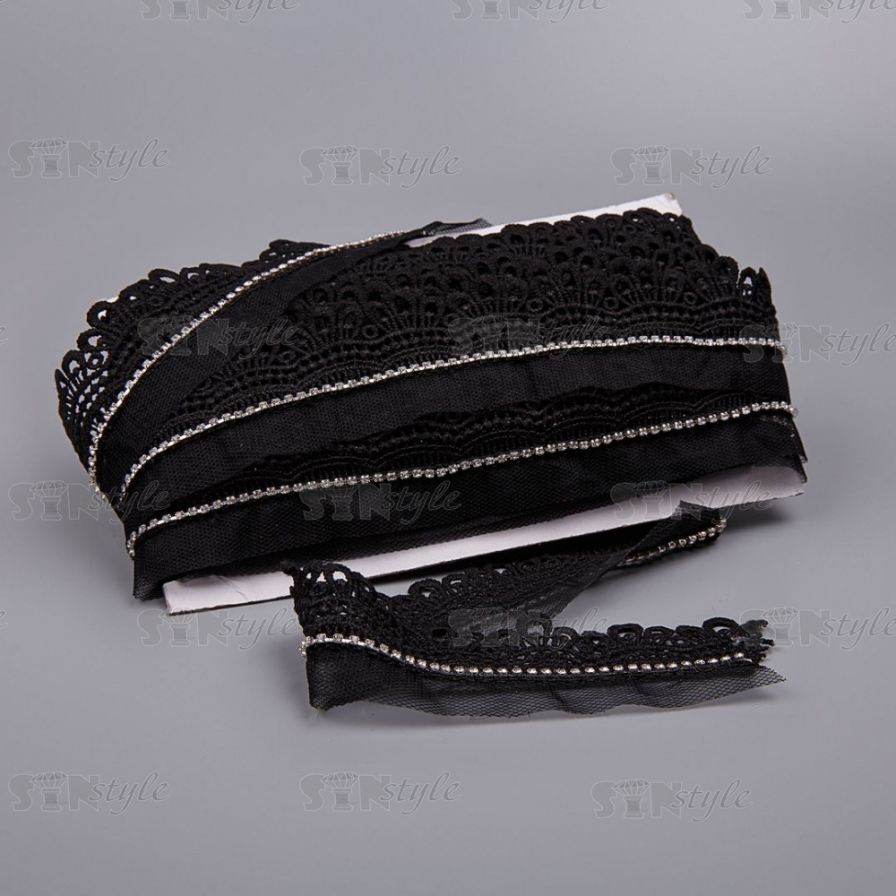 Кружево ажурное на сетке с отделкой стразами, ширина 40 мм, цвет черный, стразы белые, намотка 15 ярдов