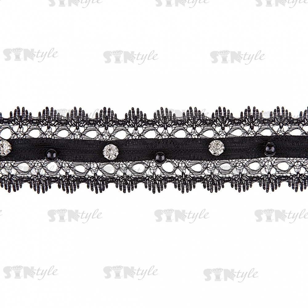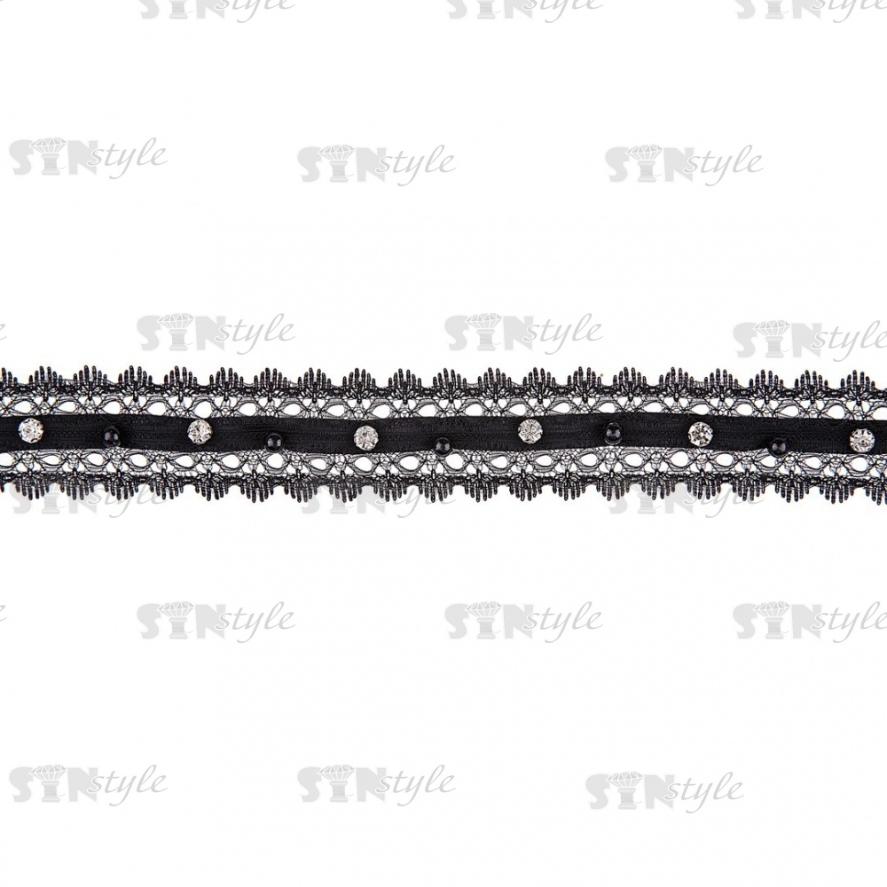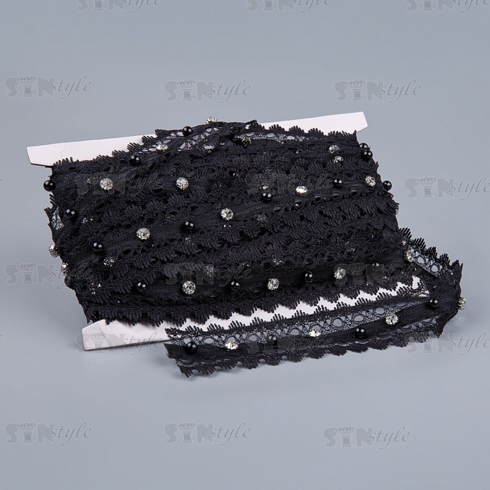 Кружево ажурное с отделкой стразами, ширина 35 мм, цвет черный, намотка 10 ярдов