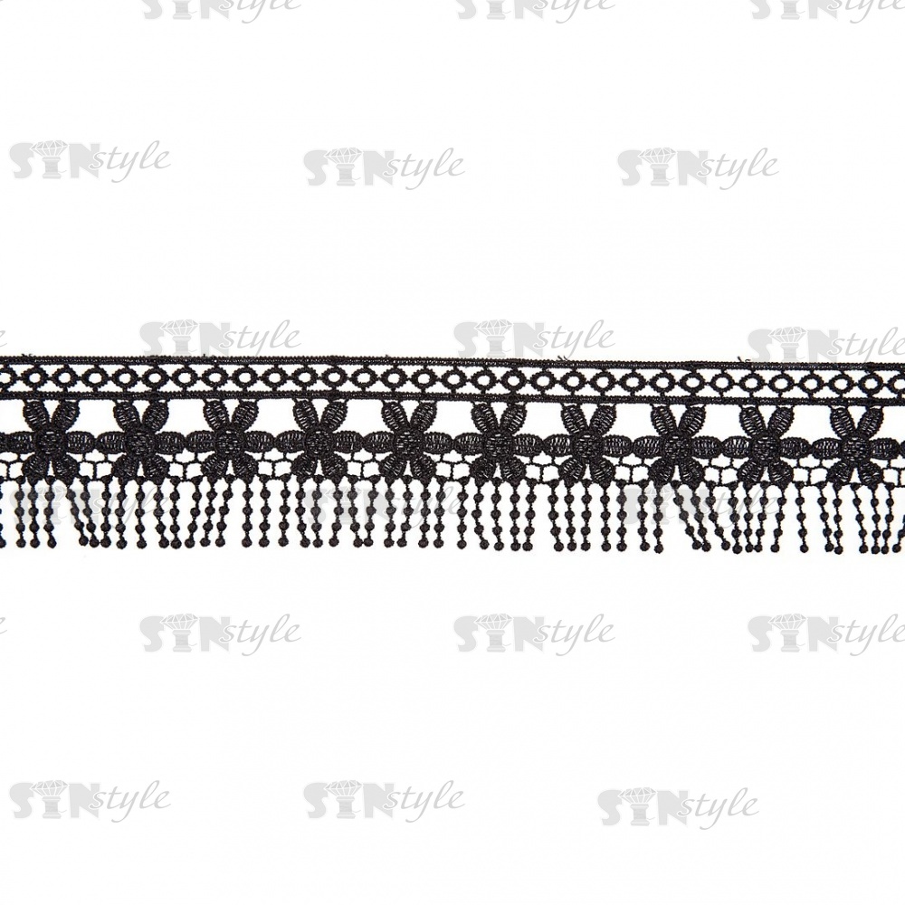 Тонкое ажурное кружево с бахромой по нижнему краю, ширина 55 мм, цвет черный, намотка 10 ярдов