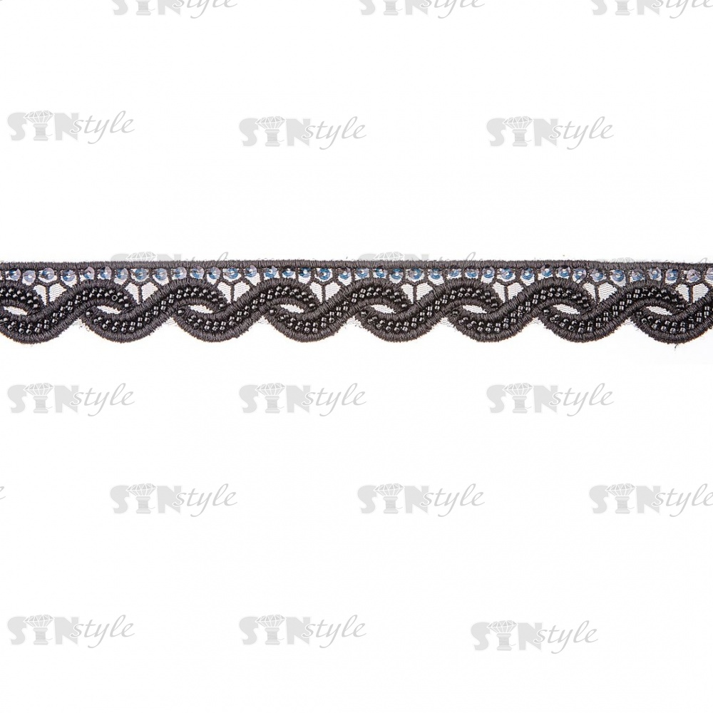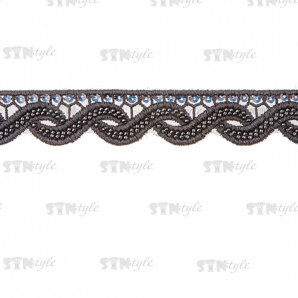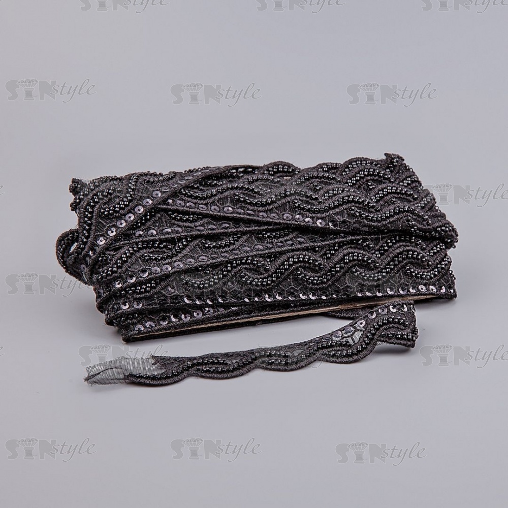 Кружево на сетке с отделкой пайетками и микробисером, нежное ажурное плетение, расшитое пайетками и микробисером по всей длине, ширина 30 мм, цвет черный, намотка 10 ярдов (C8)