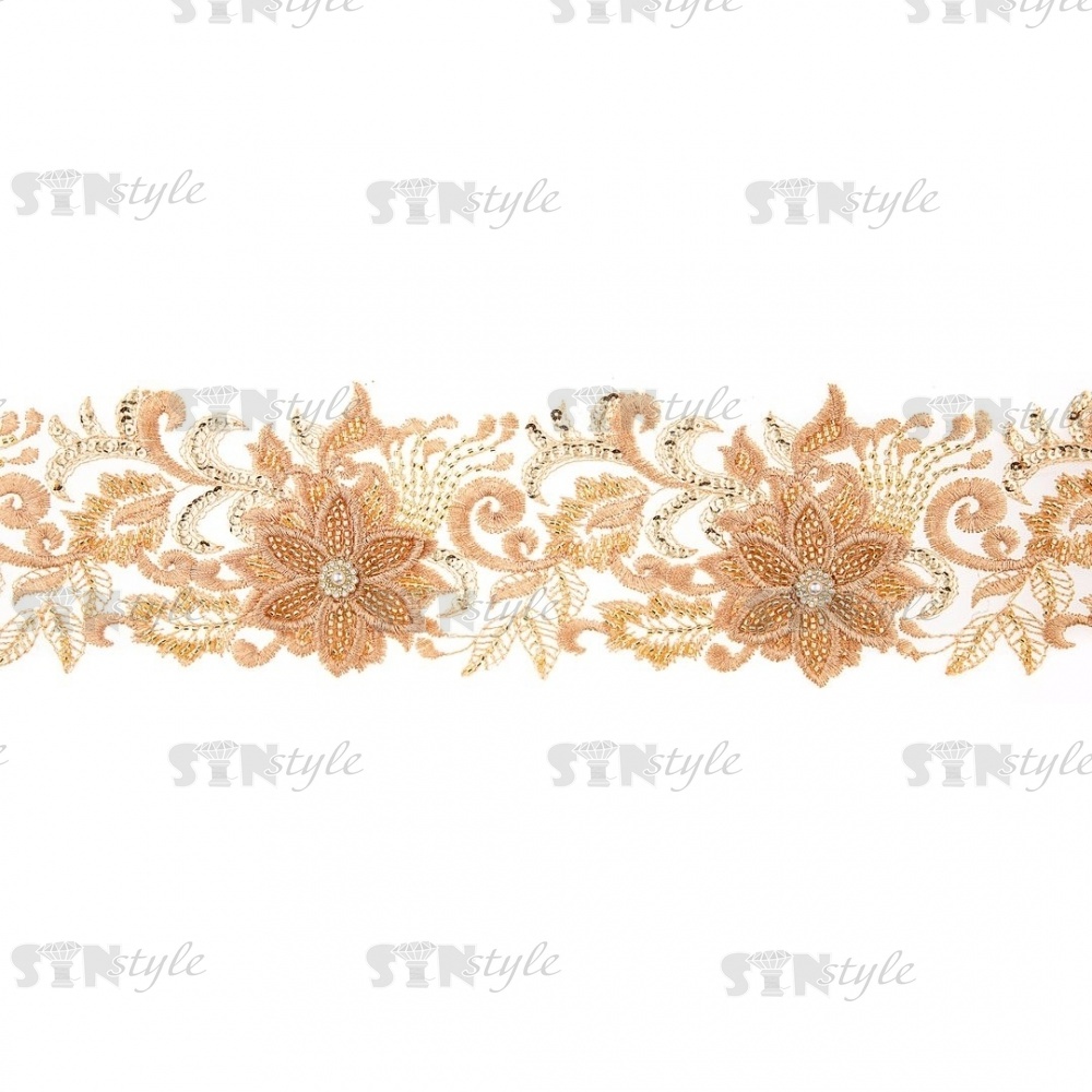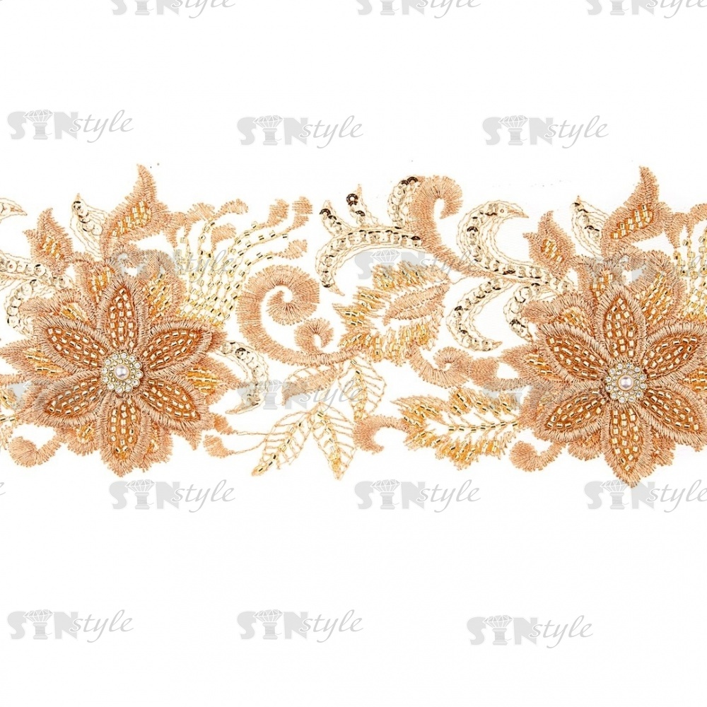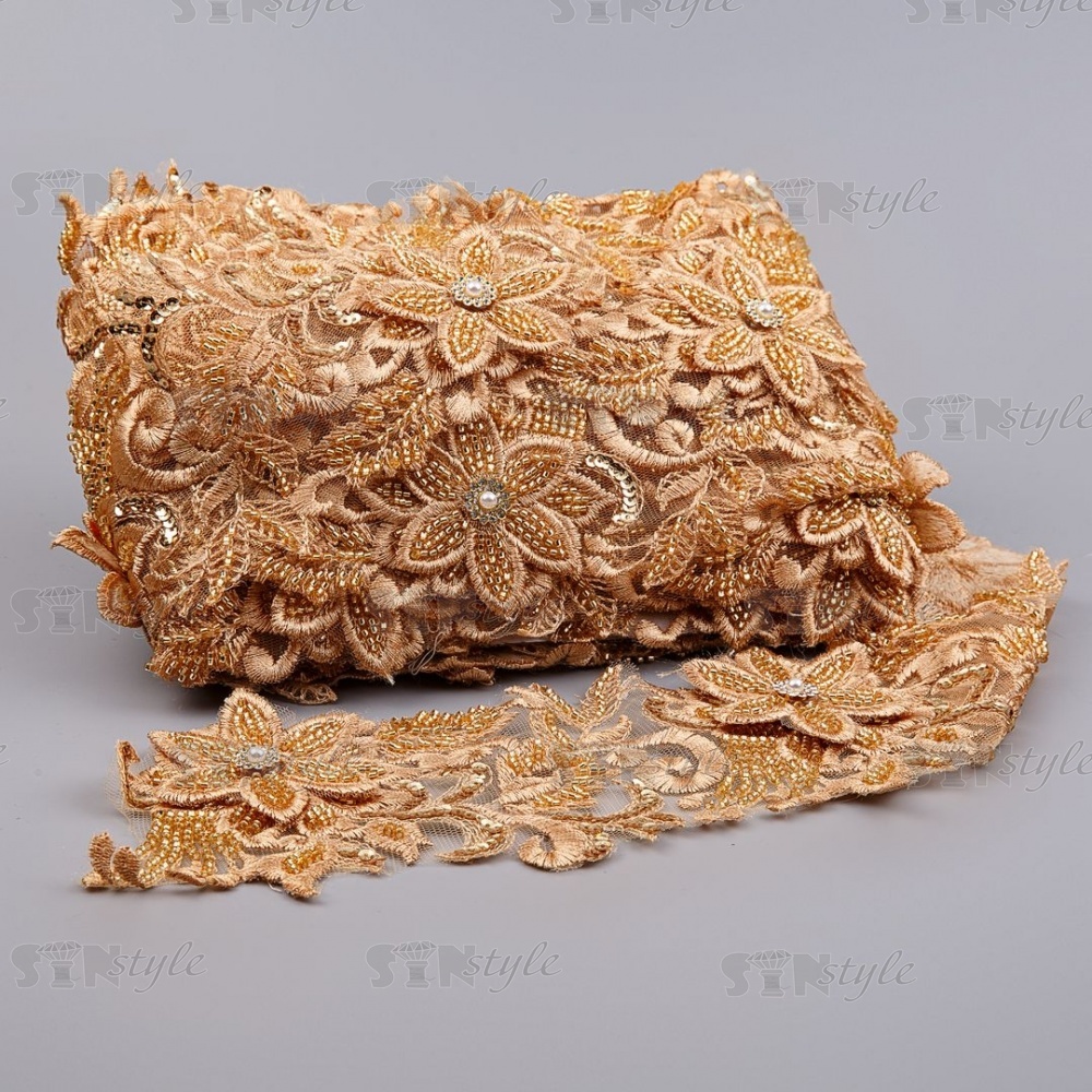 Кружево 3D на сетке с цветочным орнаментом, расшитое микробисером, пайетками и стразами, ширина 100 мм, цвет золотой, намотка 10 ярдов