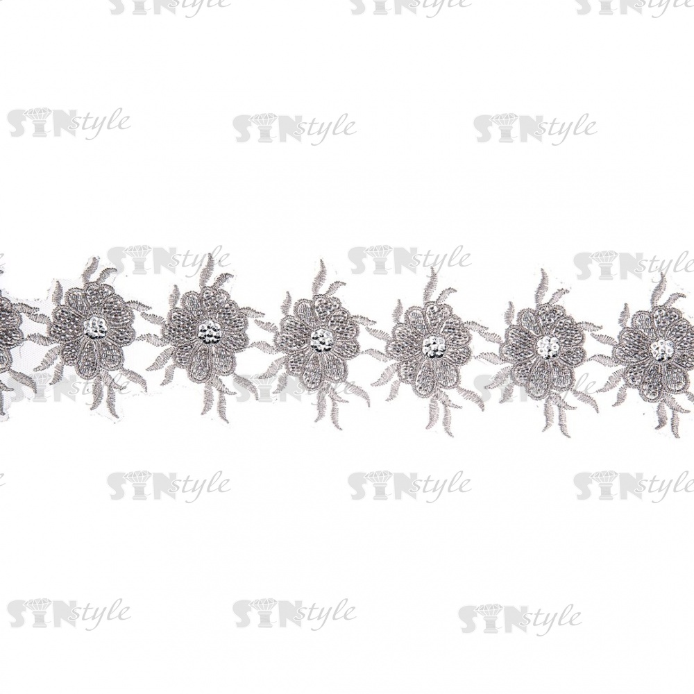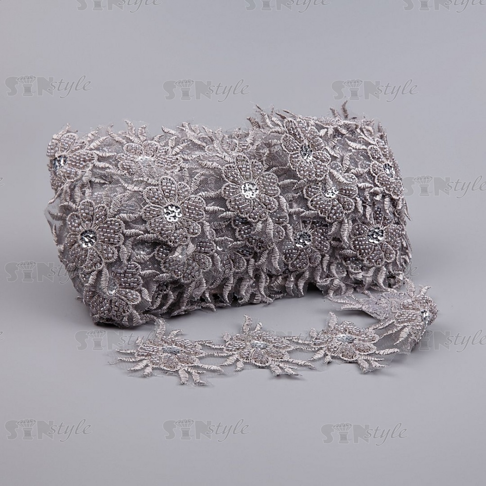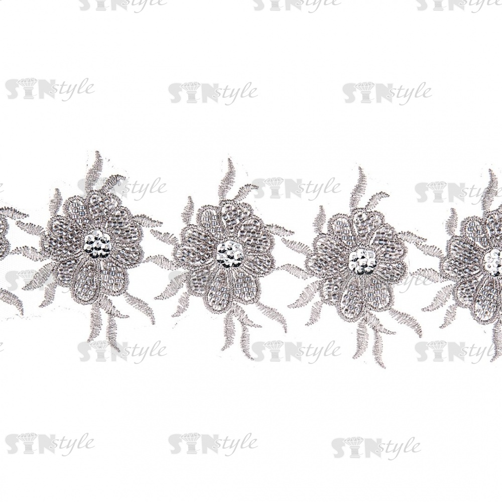Кружево на сетке с цветочным орнаментом, расшитое пайетками и микробисером, вширина 75 мм, цвет серебряный, намотка 10 ярдов
