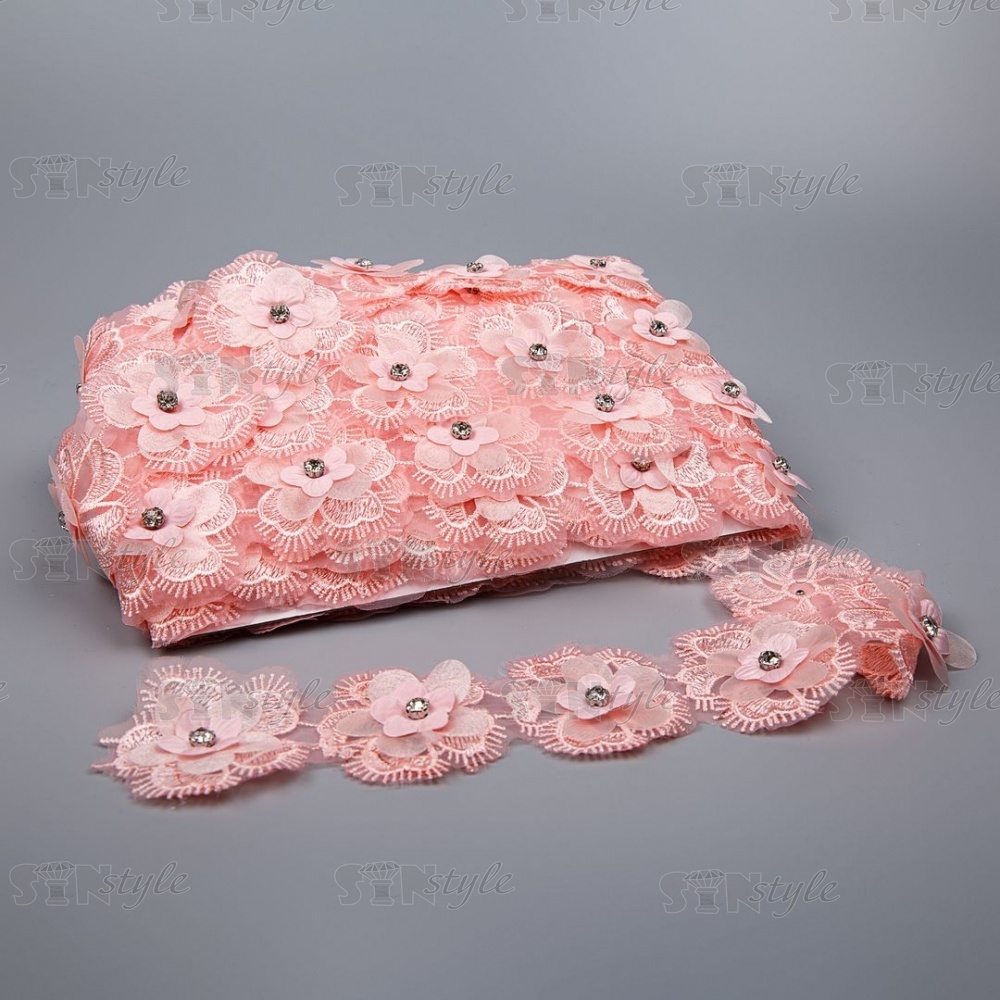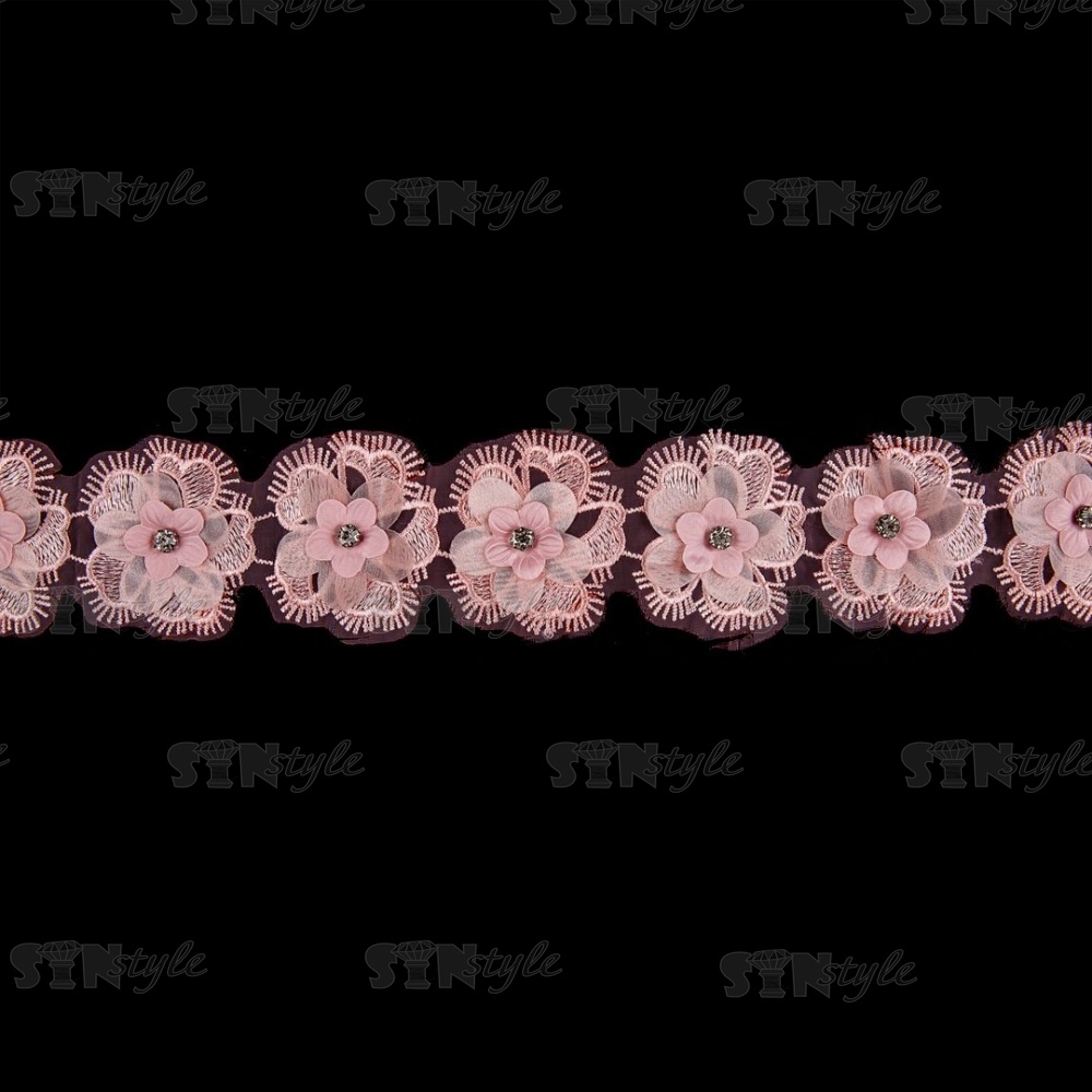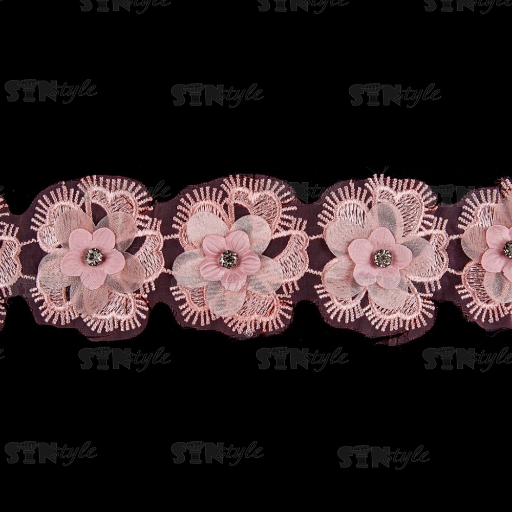Кружево "Цветочное", ширина 55 мм, цвет розовый, с белыми стразами, намотка 10 ярдов