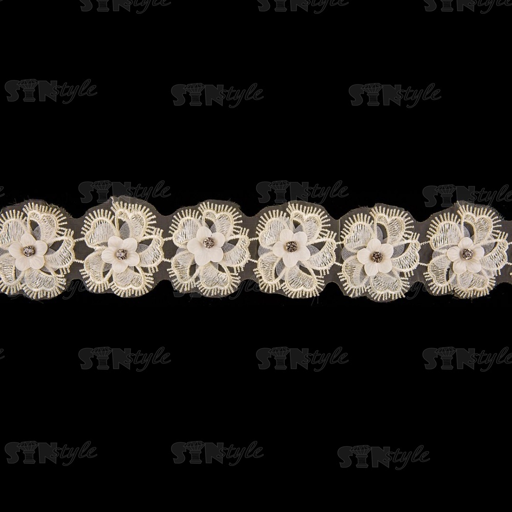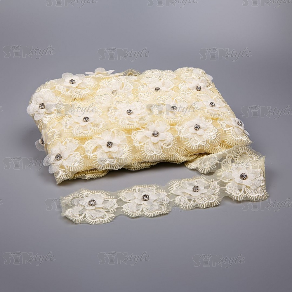 Кружево "Цветочное", ширина 55 мм, цвет шампань, с белыми стразами, намотка 10 ярдов
