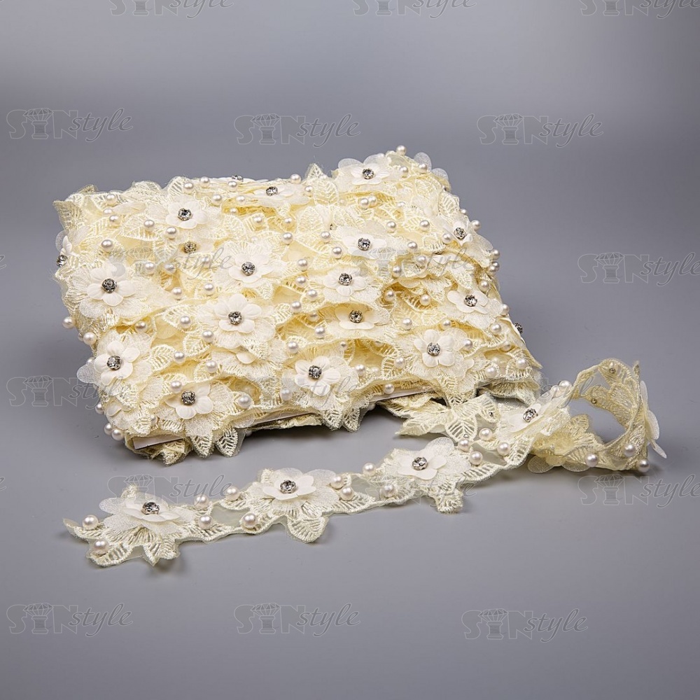Кружево "Цветочное", ширина 60 мм, цвет шампань, декорировано бусинами в цвет кружева и белыми стразами, намотка 10 ярдов
