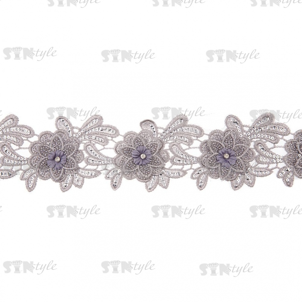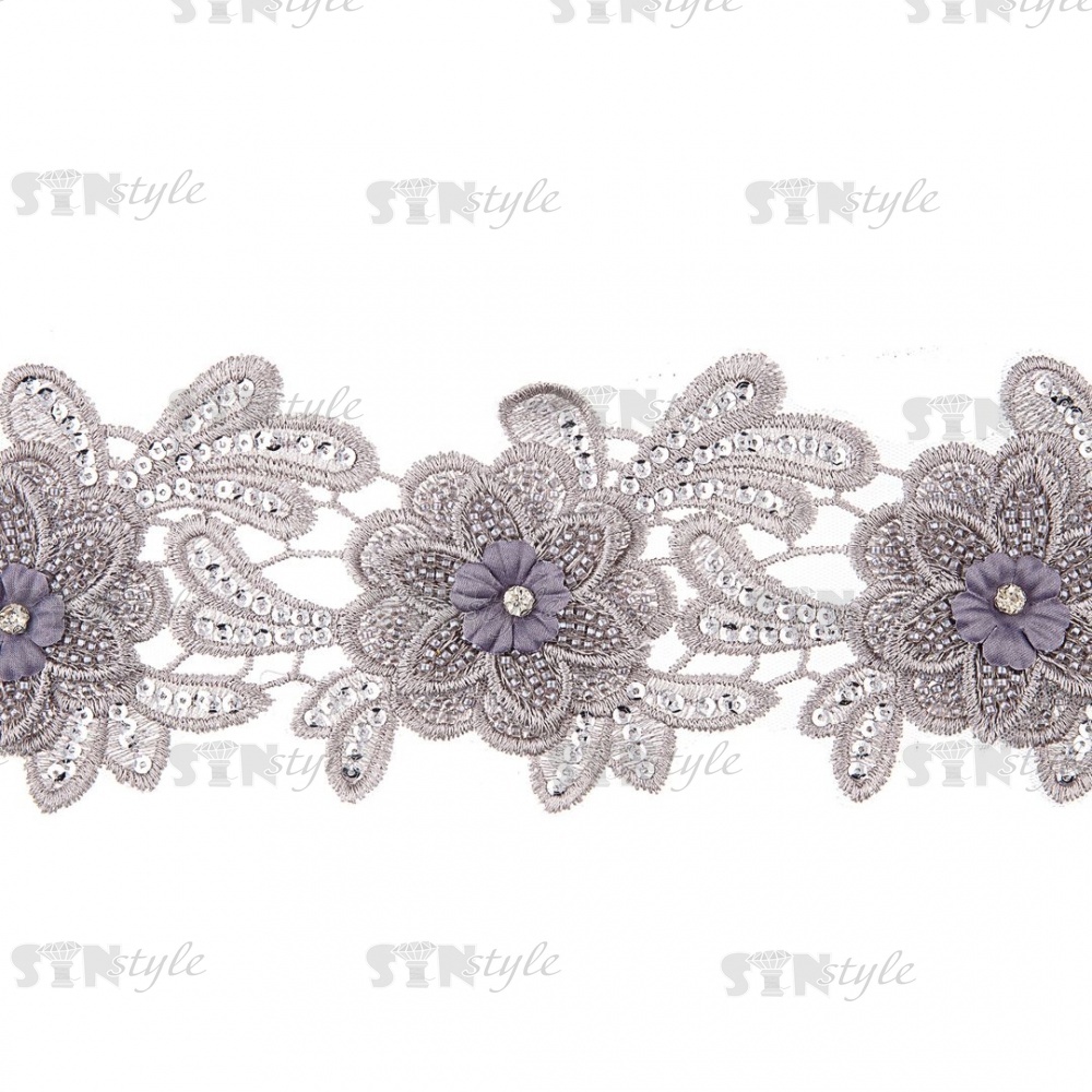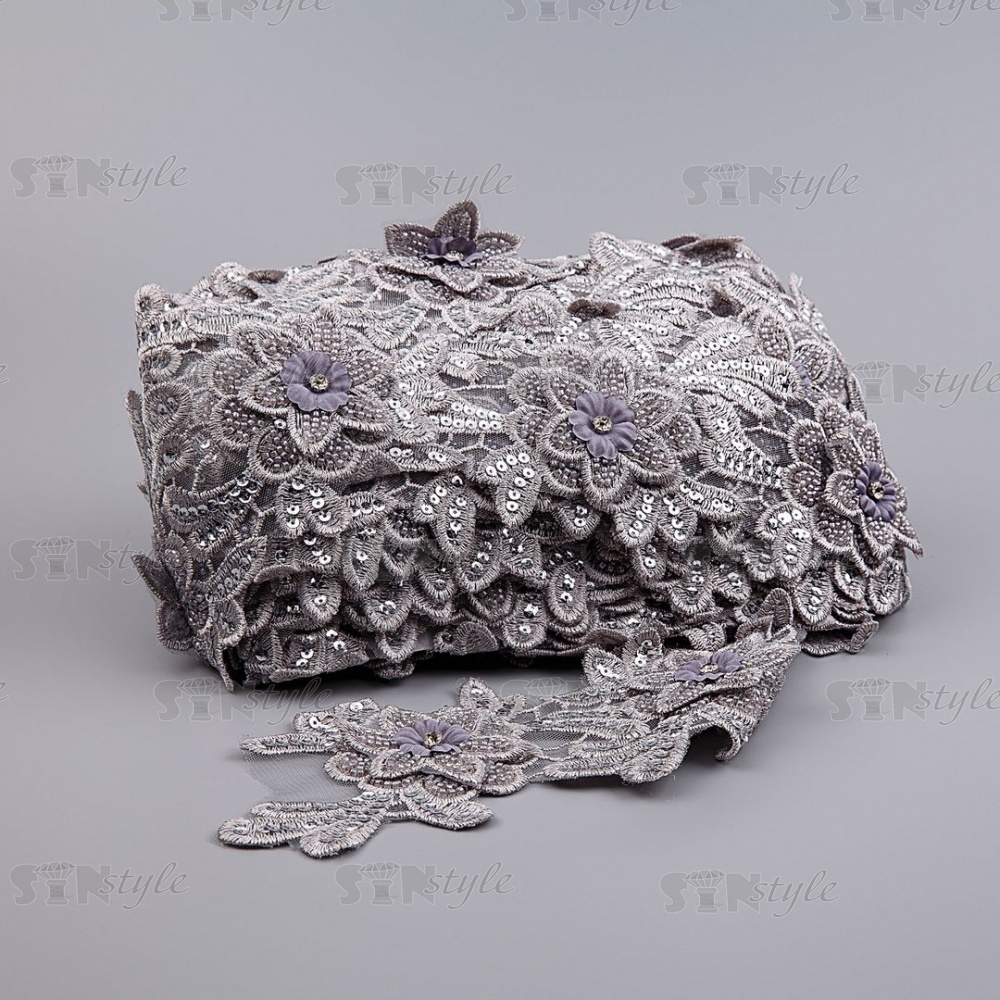 Кружево 3D на сетке с цветочным орнаментом, расшитое микробисером, пайетками и стразами, ширина 100 мм, цвет серебряный, намотка 10 ярдов