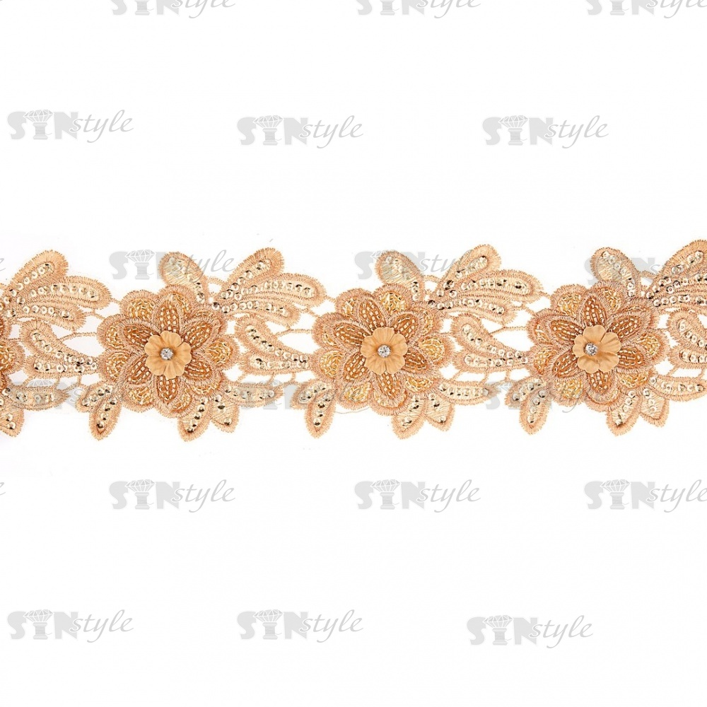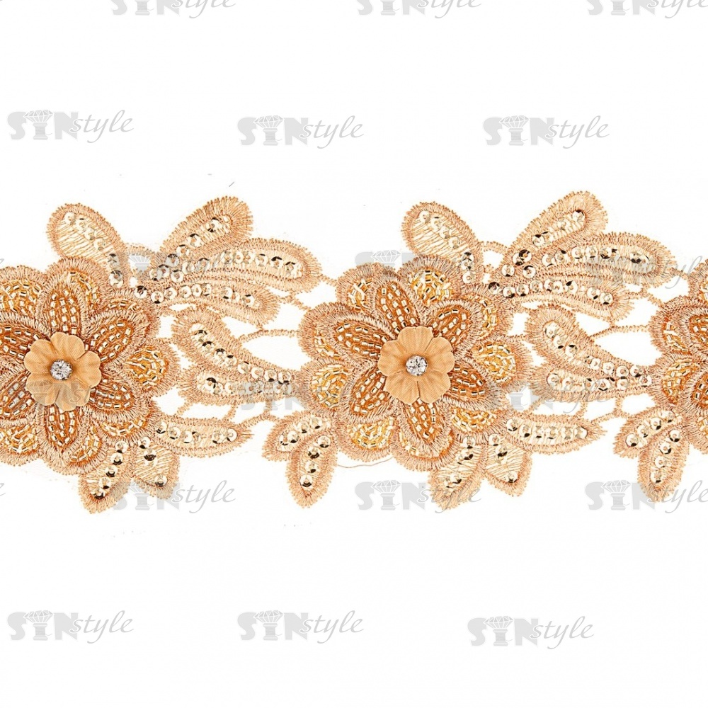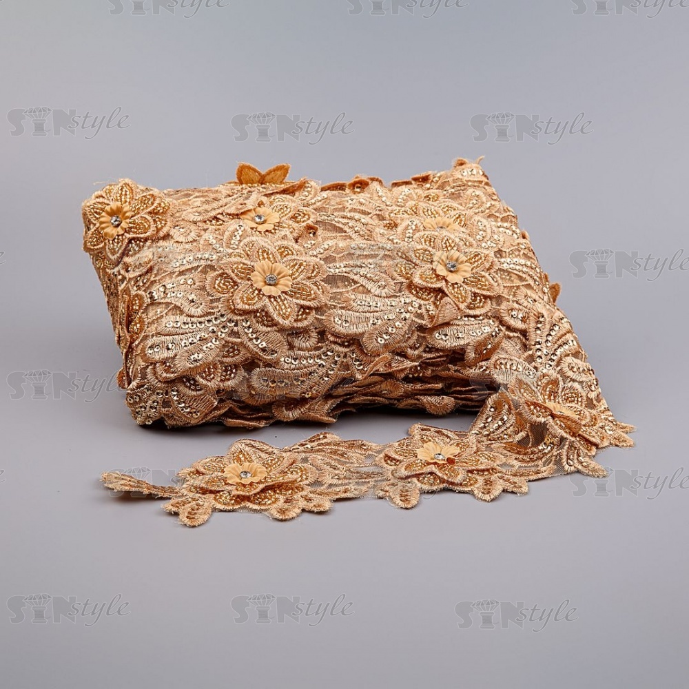Кружево 3D на сетке с цветочным орнаментом, расшитое микробисером, пайетками и стразами, ширина 100 мм, цвет золотой, намотка 10 ярдов