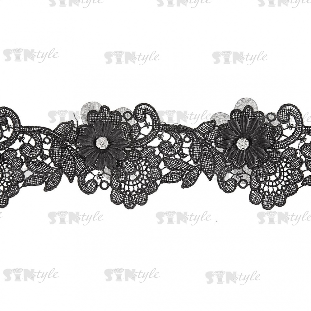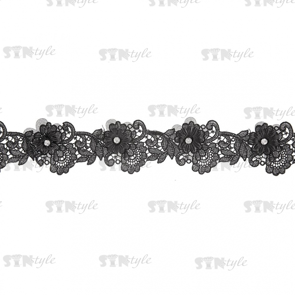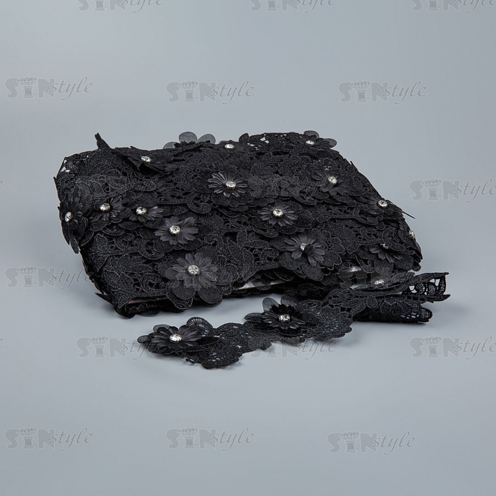 Тонкое ажурное кружево, декорированное объемными цветами и стразами, ширина 55 мм, цвет черный/стразы белые, намотка 15 ярдов