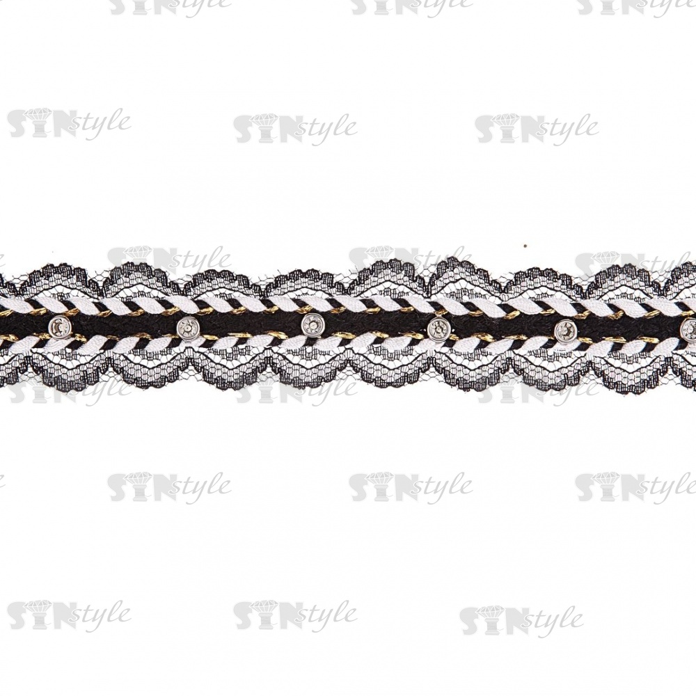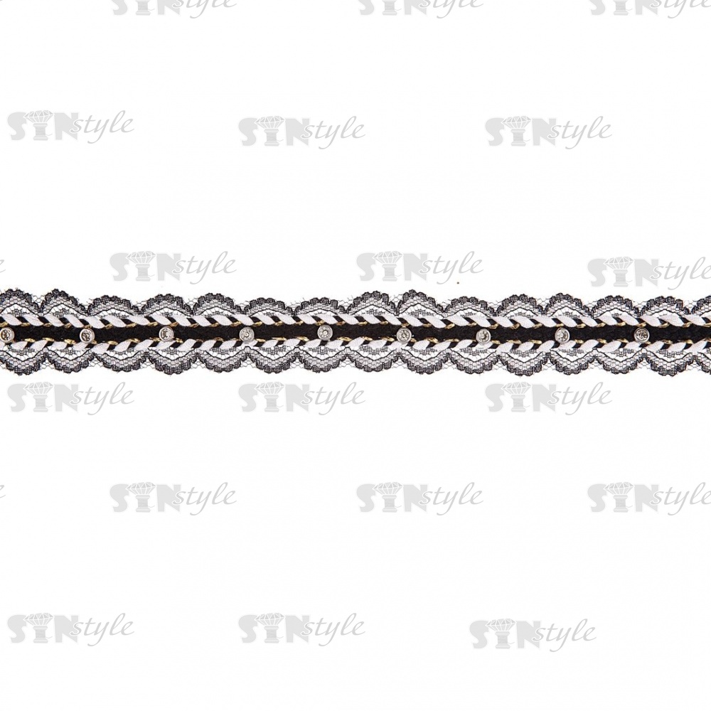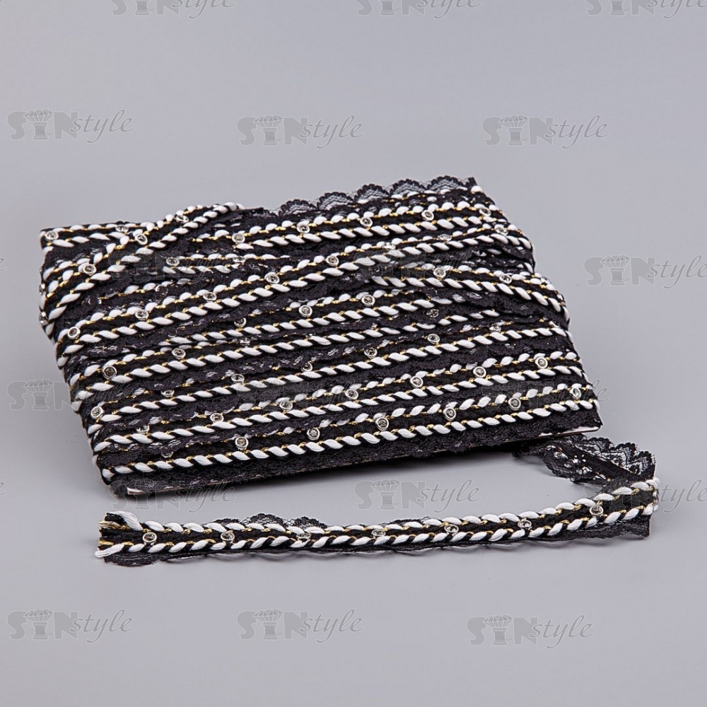 Тонкое черное кружево, украшенное черным и белым шнуром, с люрексом и стразами, ширина 30 мм, намотка 15 ярдов