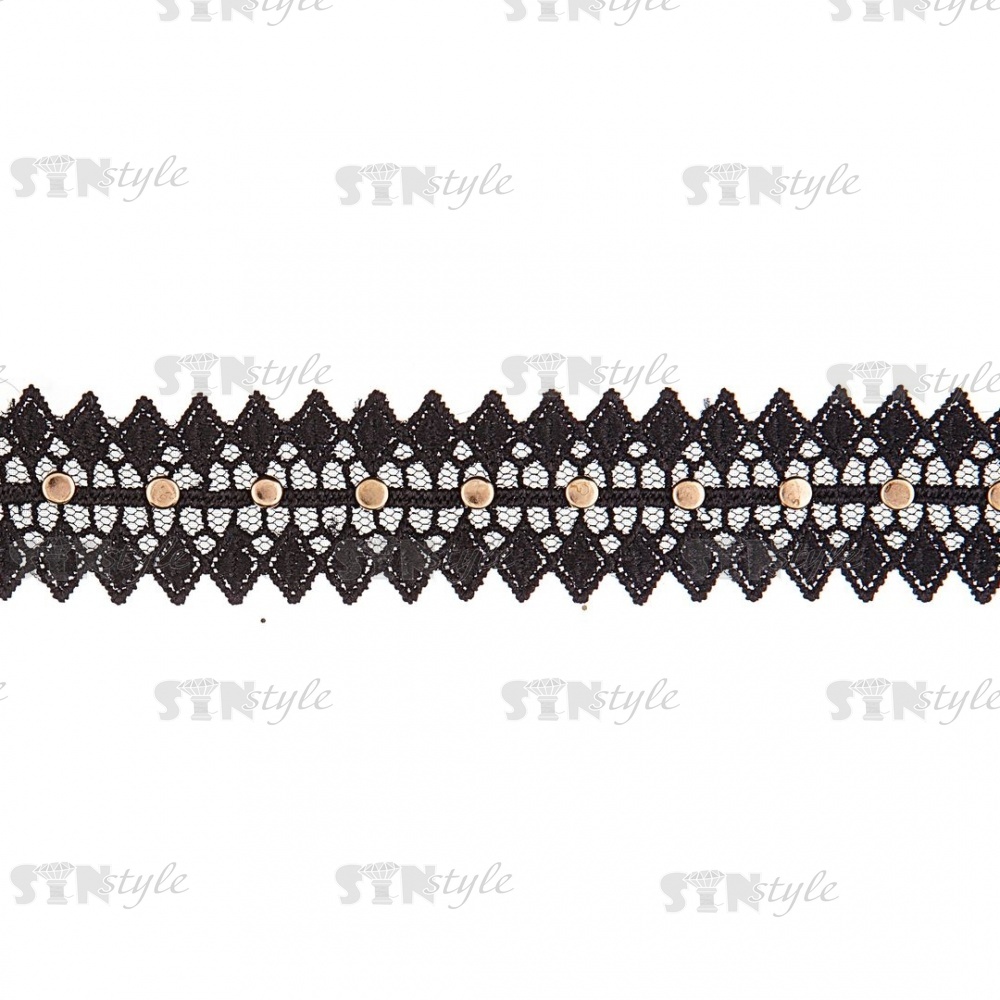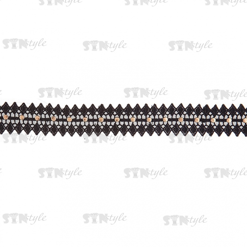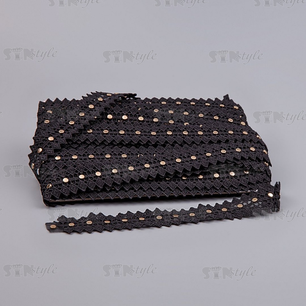 Тесьма с отделкой клепками, тонкая ажурная тесьма с клепками по всей длине изделия, ширина 35 мм, цвет черный/клепки золото, намотка 15 ярдов