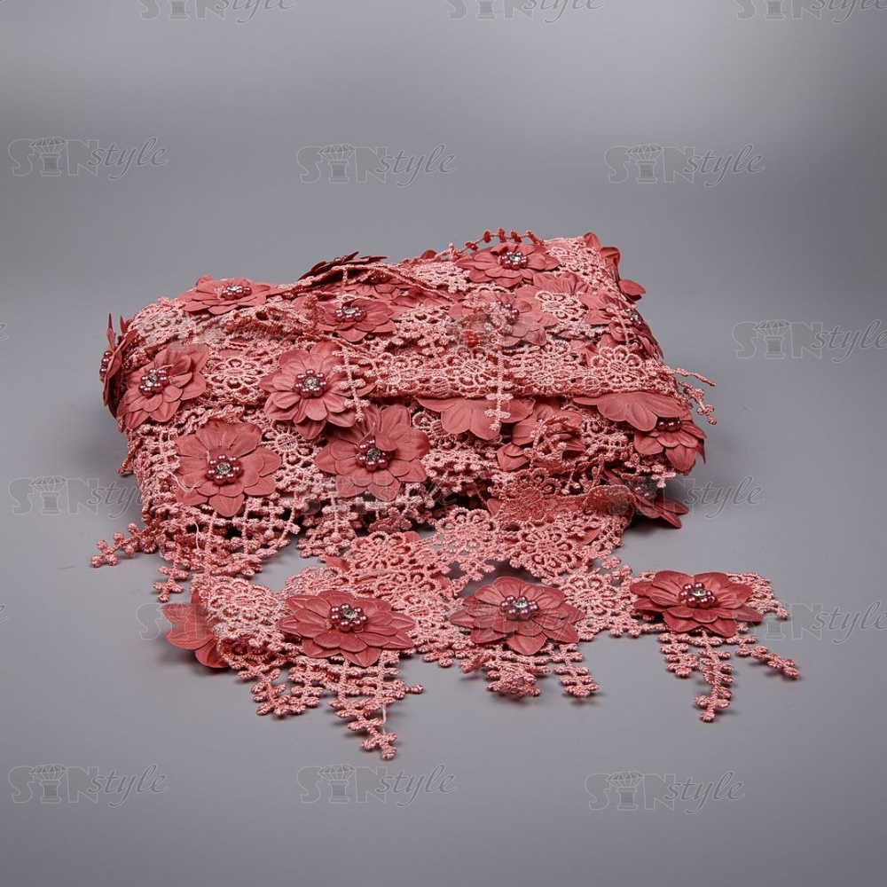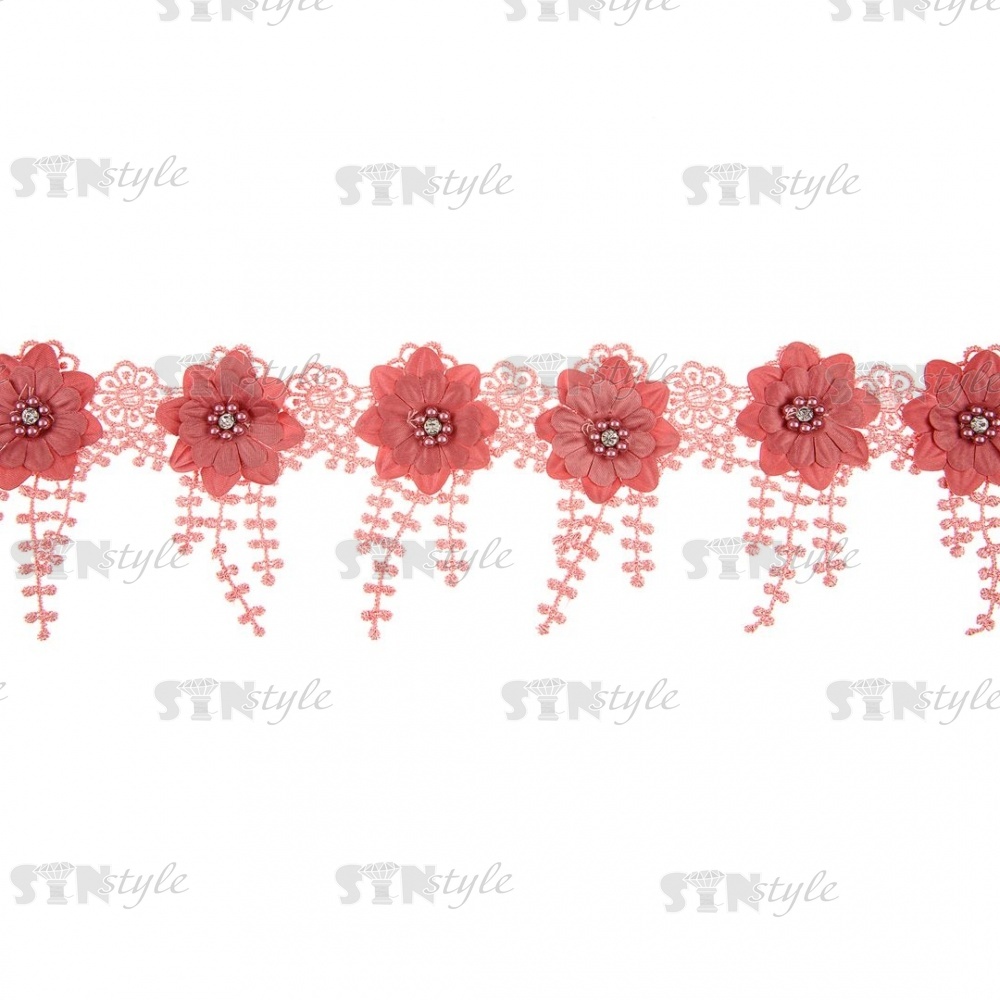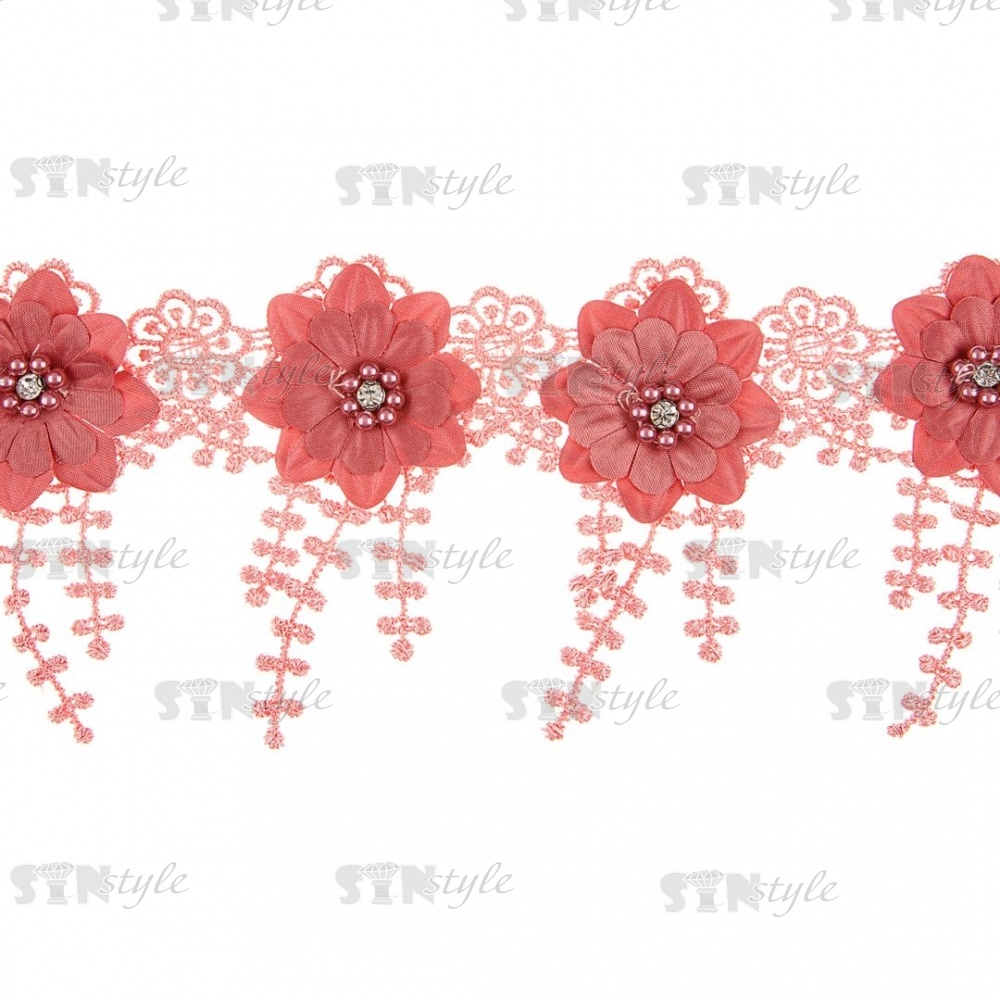 Тонкое ажурное кружево, декорированное цветами, бусинами и стразами, ширина 90 мм, цвет грязно-розовый, намотка 10 ярдов