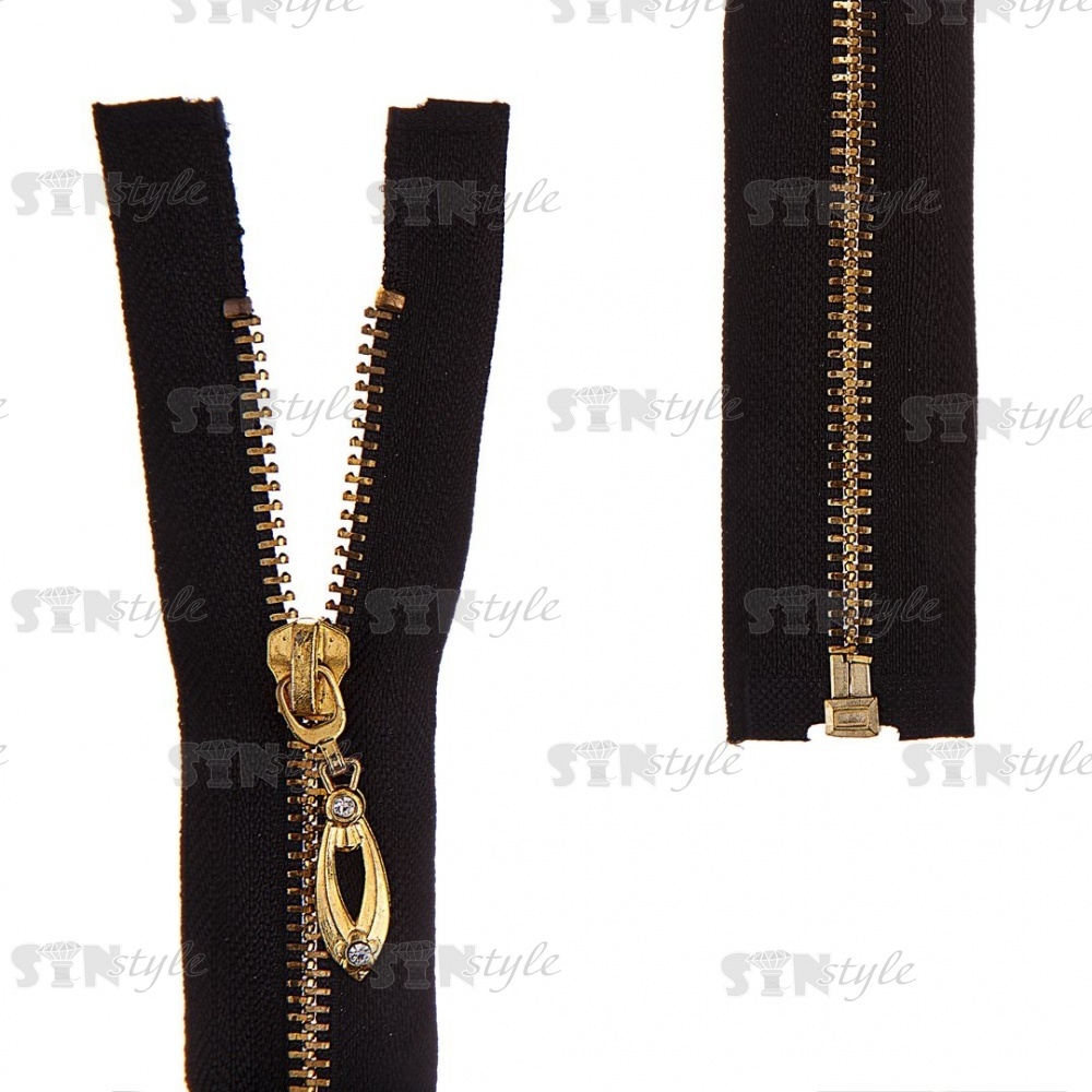 Молния металлическая, тип 5, разъемная, длина 80 см, цвет 322 (черный), звенья золотистые, бегунок золотистого цвета со стразами