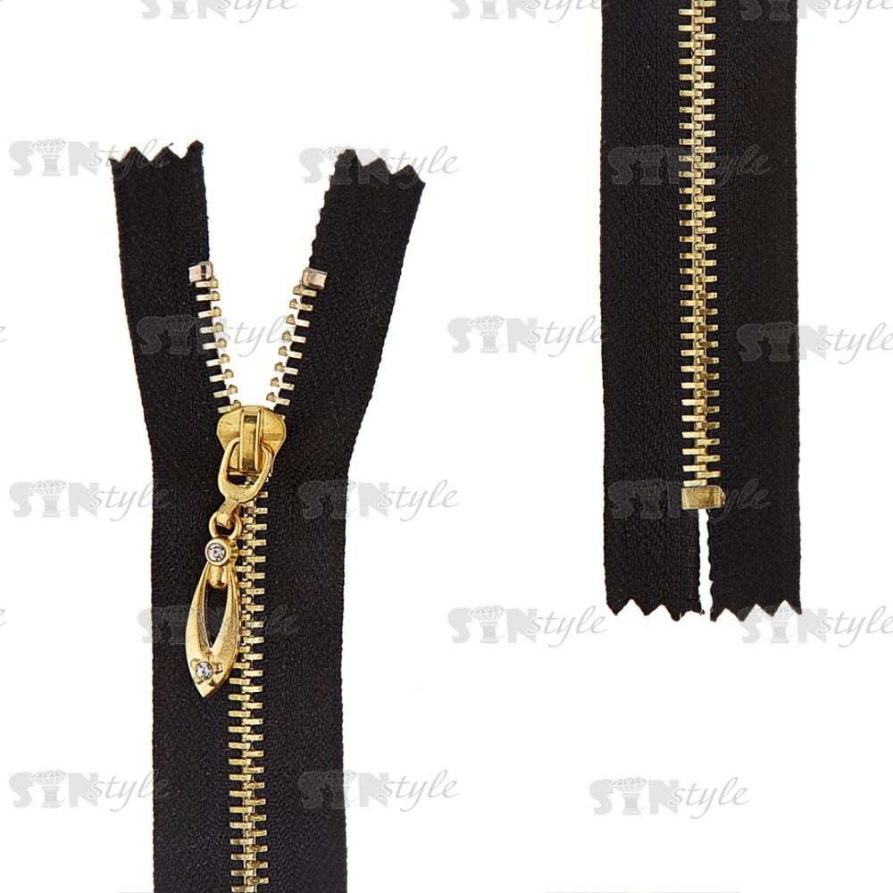 Молния металлическая, тип 5, неразъемная, длина 16 см, цвет 322 (черный), звенья золотистые, бегунок золотистый со стразами