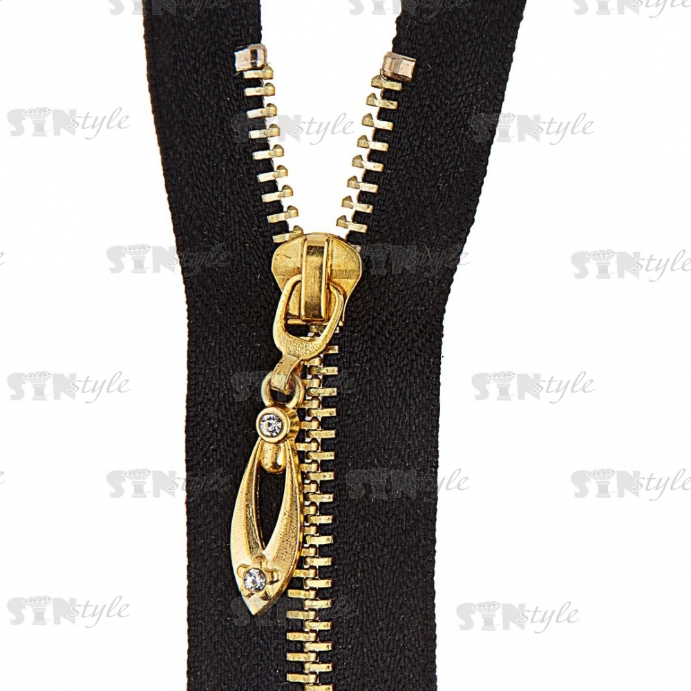 Молния металлическая, тип 5, неразъемная, длина 18 см, цвет 322 (черный), звенья золотистые, бегунок золотистый со стразами