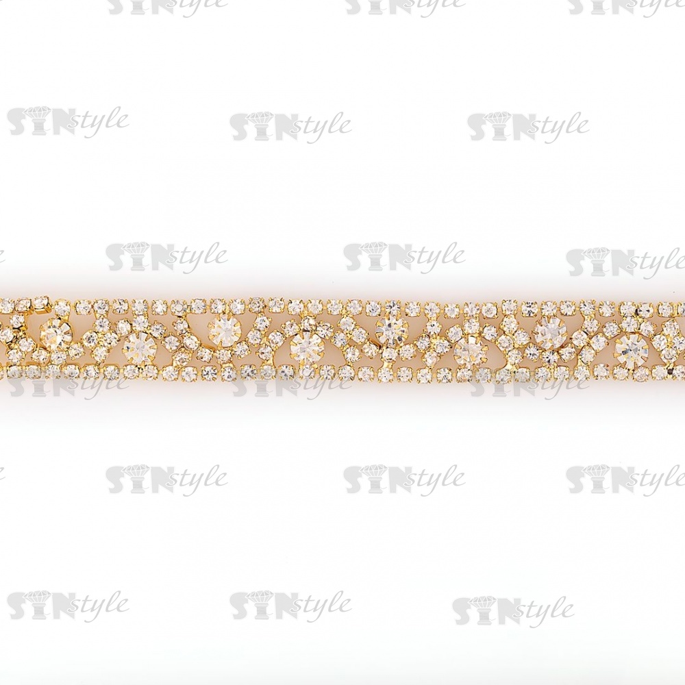 Цепочка декоративная металлическая золотого цвета с белыми стеклянными стразами, ширина 11 мм, намотка 5 ярдов
