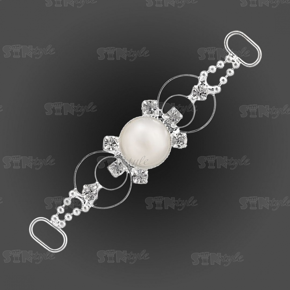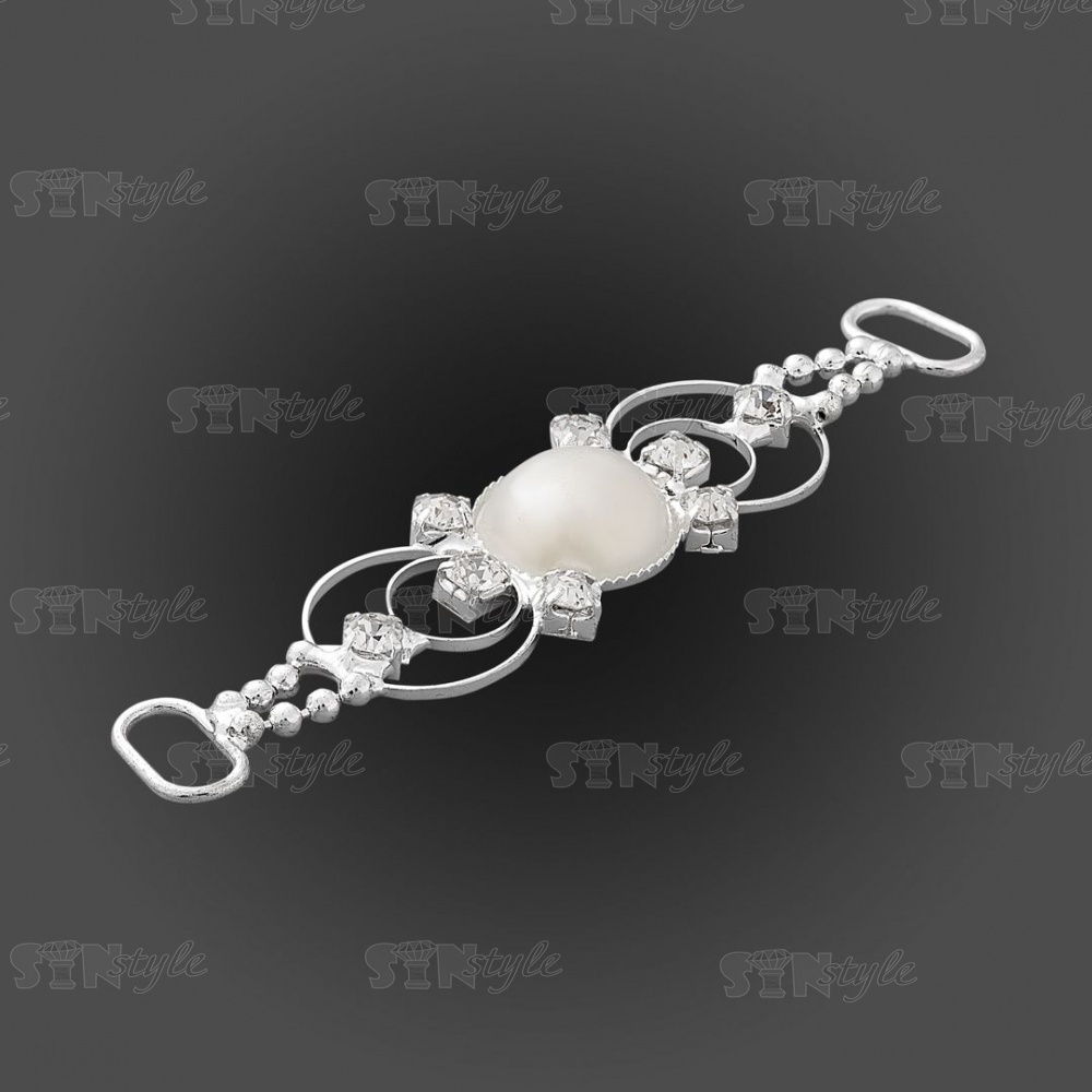 Декоративное украшение пришивное металлическое, цвет никель+белые бусины/белые стразы, размер 73*15 мм