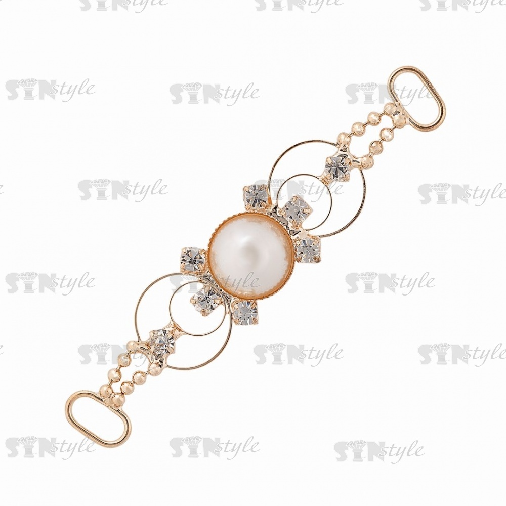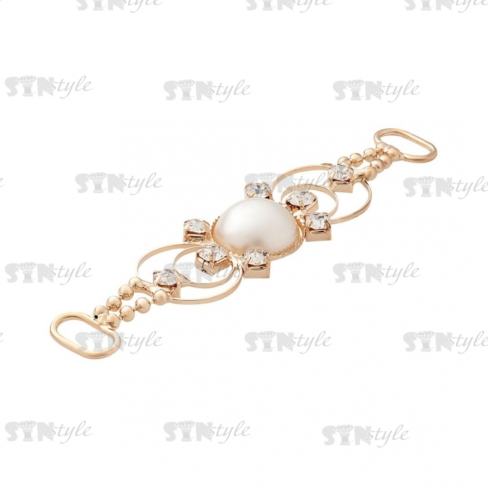 Декоративное украшение пришивное металлическое, цвет золото+белые бусины/белые стразы, размер 73*15 мм