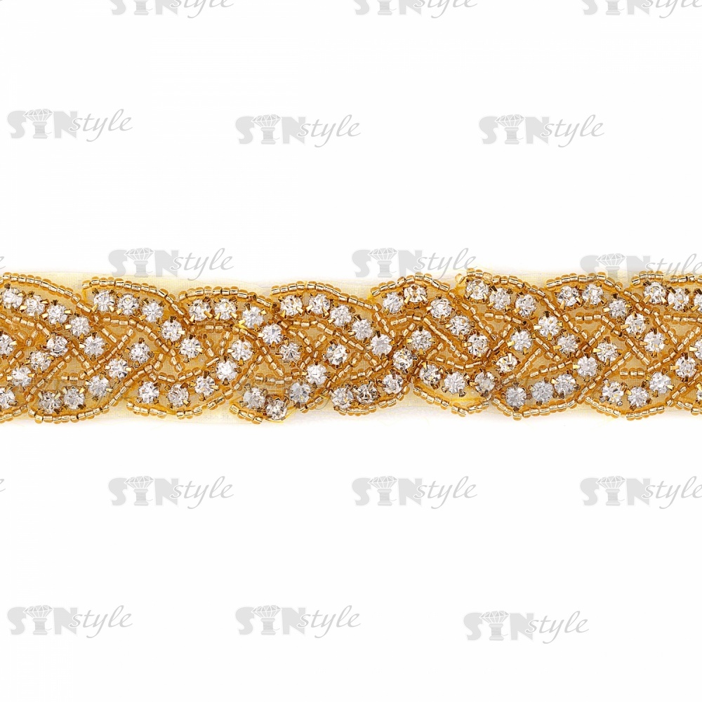 Термоаппликация "Пояс" из бисера и стеклянных страз, цвет золотой/стразы белые, размер 25х900 мм