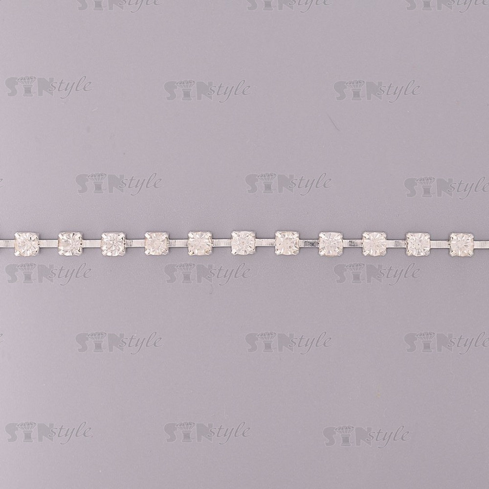 Цепочка декоративная металлическая серебряного цвета с белыми стеклянными стразами, ширина 4 мм, рулон 10 ярдов