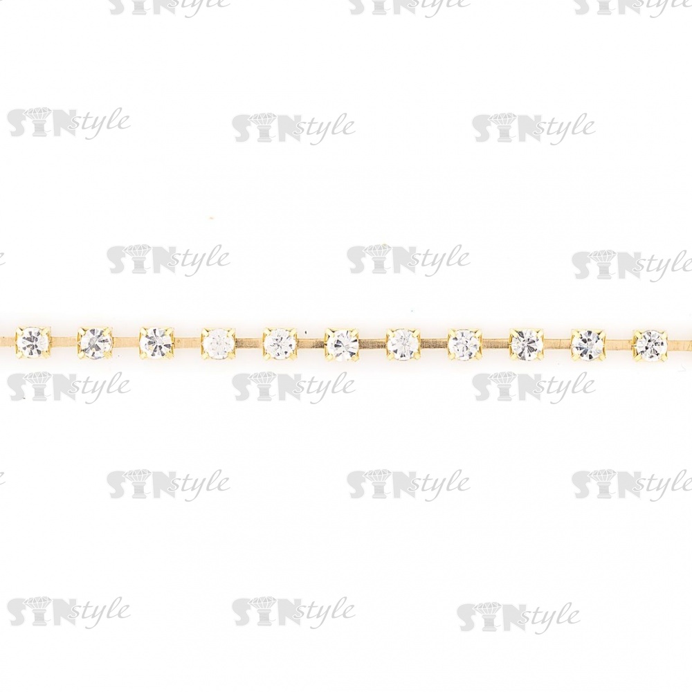 Цепочка декоративная металлическая золотого цвета с белыми стеклянными стразами, ширина 4 мм, рулон 10 ярдов