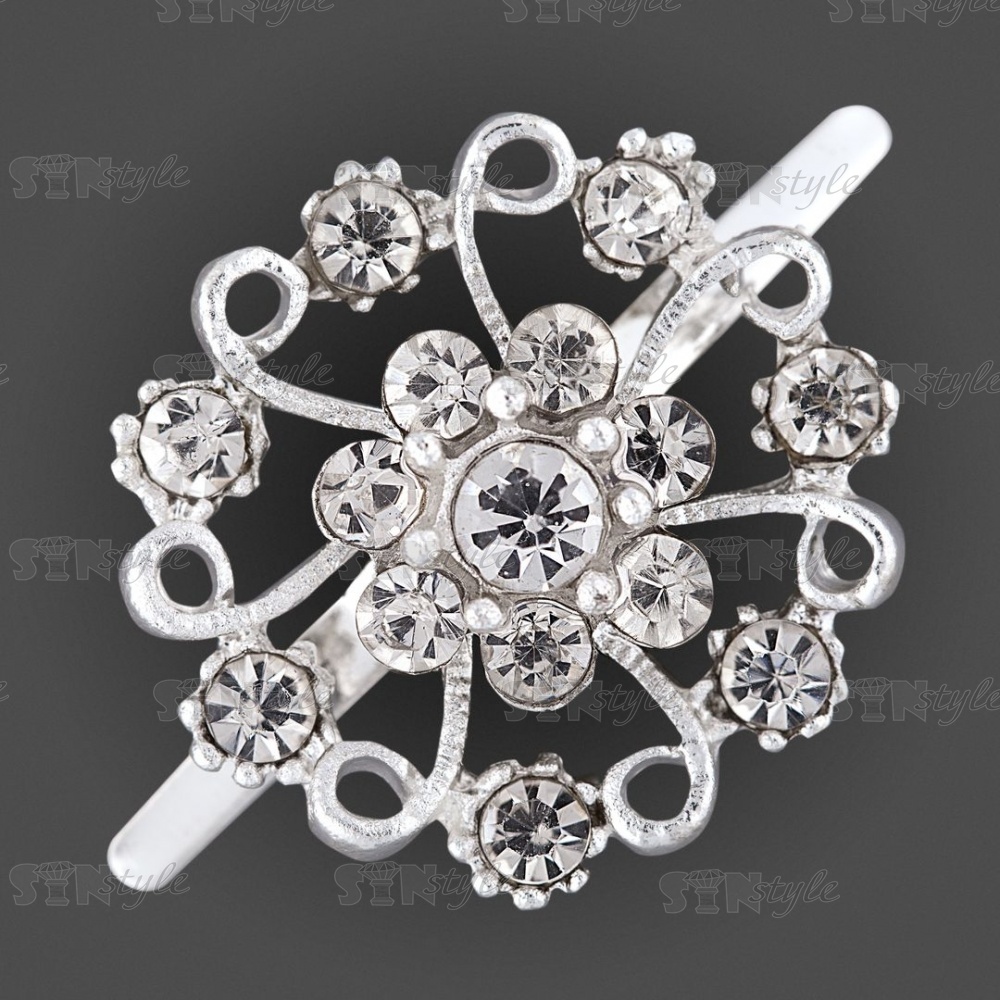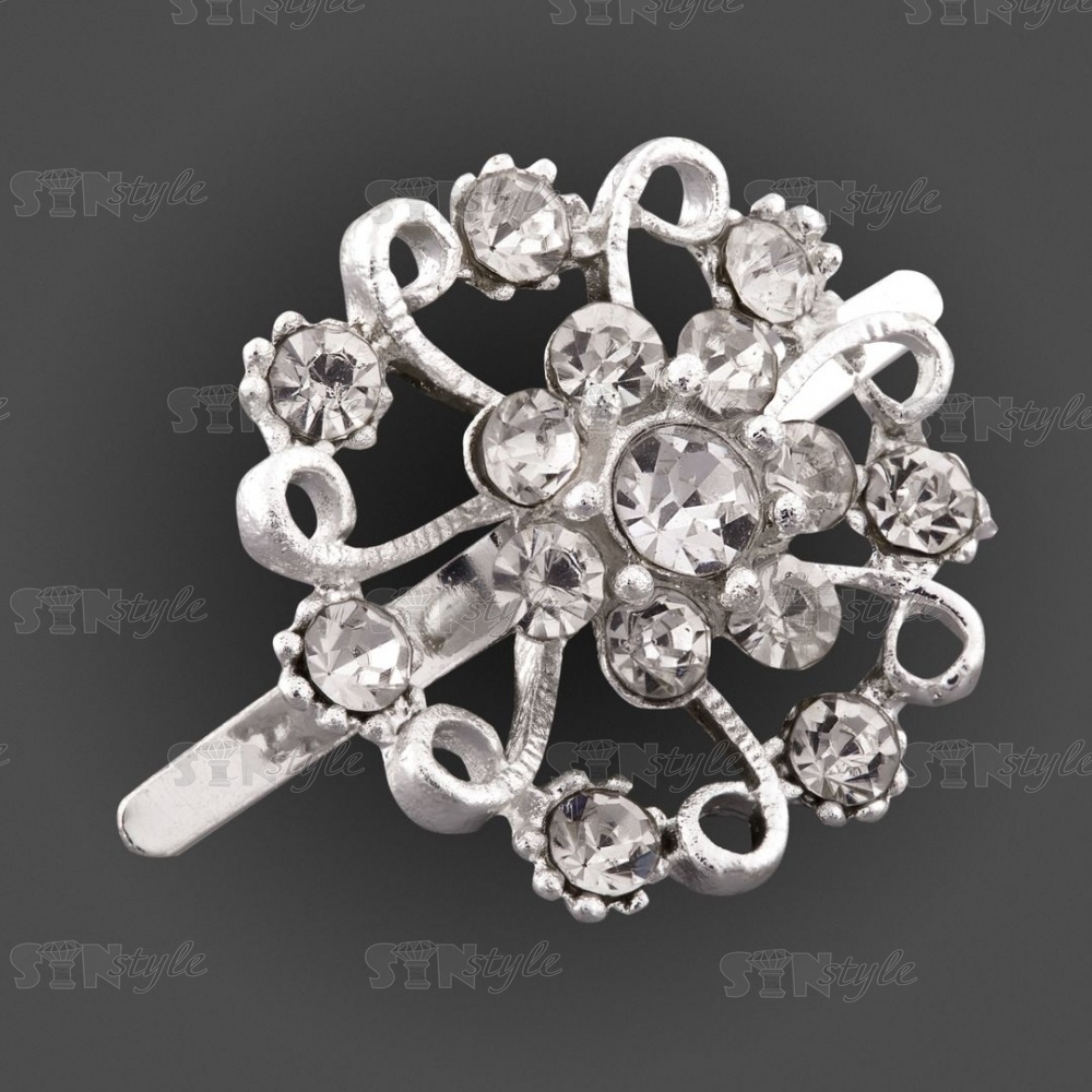 Брошь металлическая, крепление усики, диаметр 22 мм, цвет серебряный+белые стразы