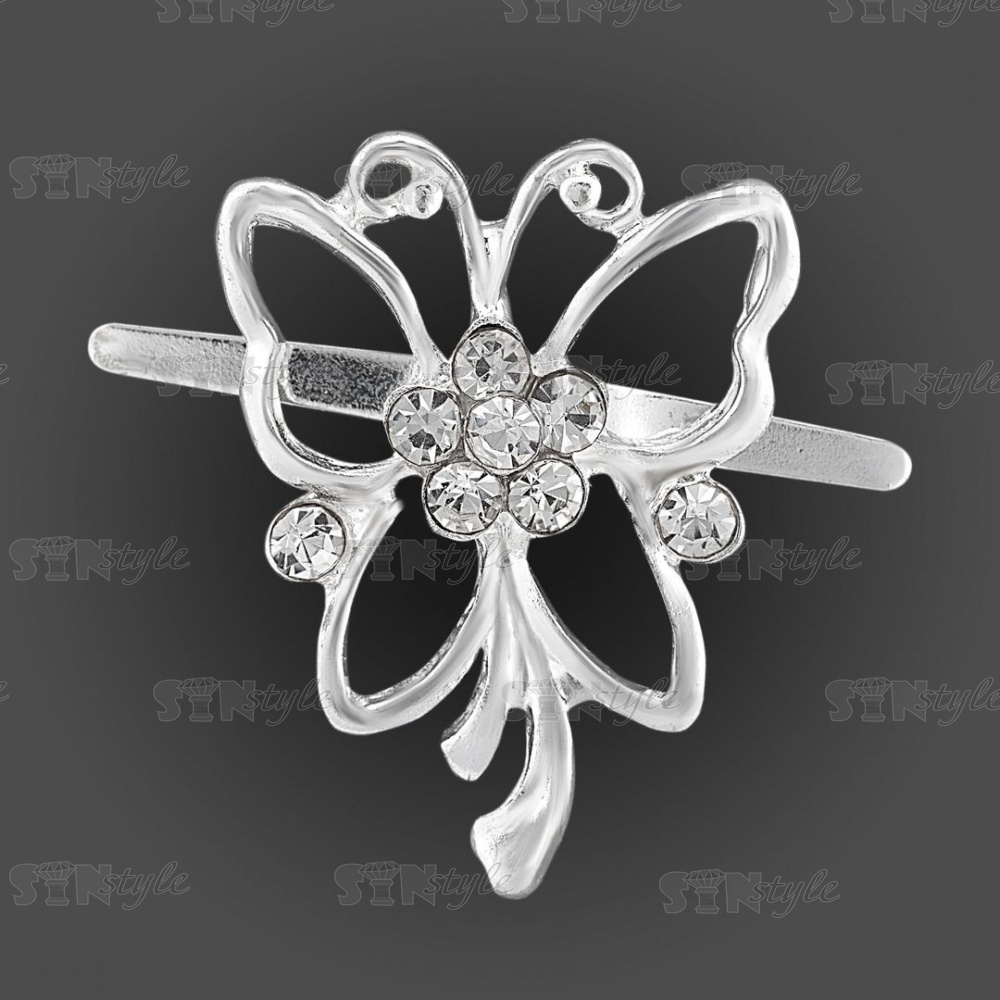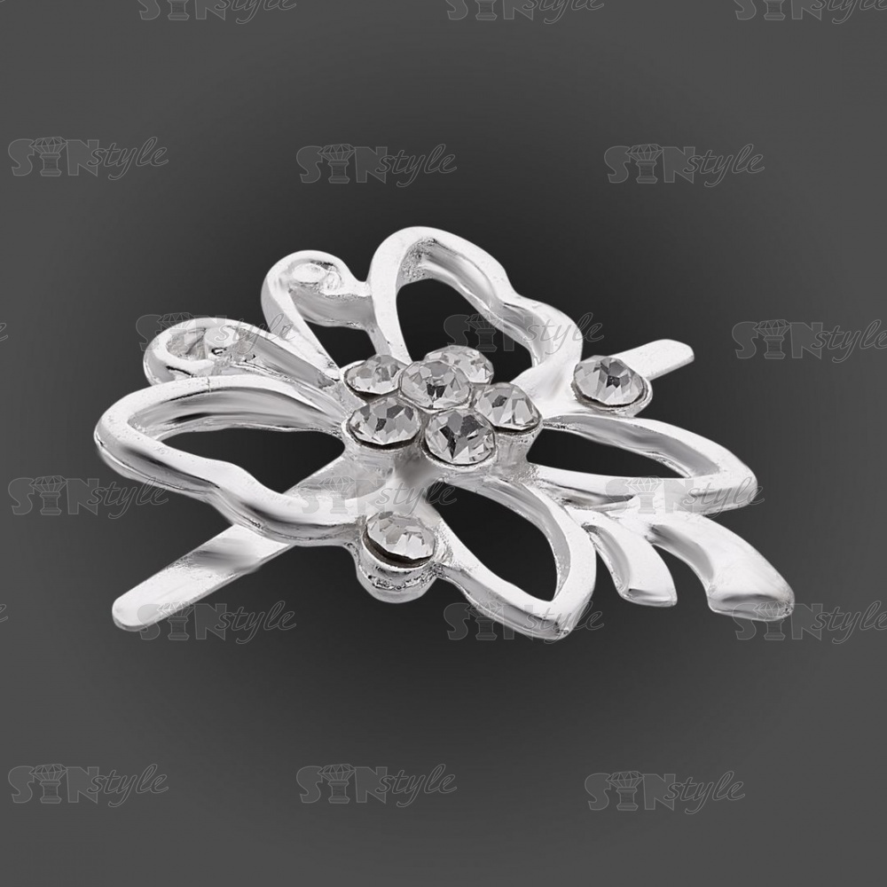 Брошь металлическая, крепление усики, размер 23 мм х 30 мм, цвет серебряный+белые стразы