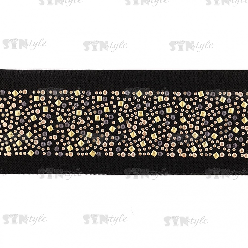Оригинальная декоративная резинка украшена золотистыми элементами. Будет шикарно смотреться на ткани любого цвета, придаст яркой индивидуальности вам и вашему изделию. Подойдет для оформления верха юбки или брюк, низа рукавов и куртки, используется в декорировании аксессуаров и многого другого.
