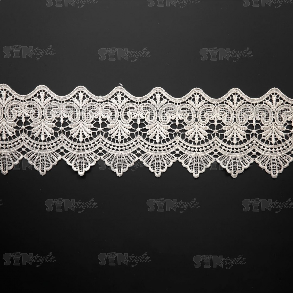 Кружево ажурное с причудливым узором и фестонами по краям, ширина 125 мм, цвет белый, намотка 14,5 ярдов