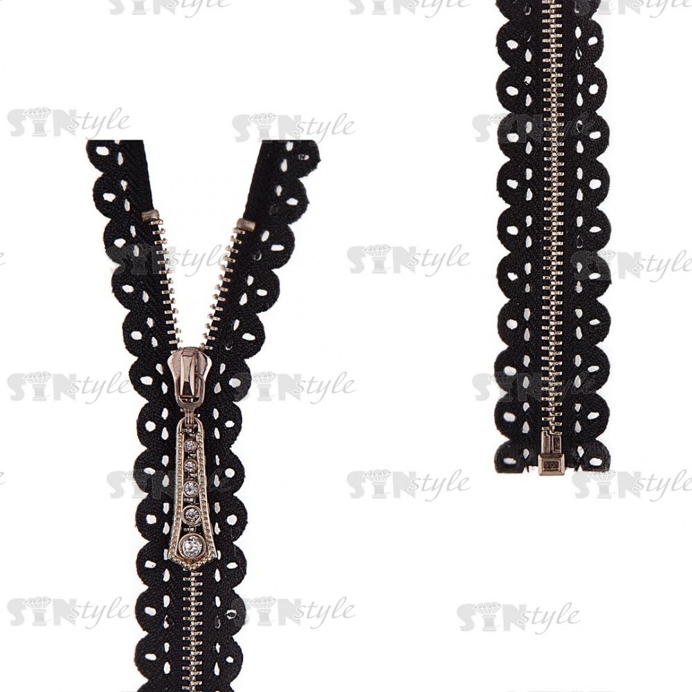 Молния металлическая, тип 3, разъемная, длина 60 см, цвет 322 (черный), звенья золотистые, бегунок золотистого цвета со стразами