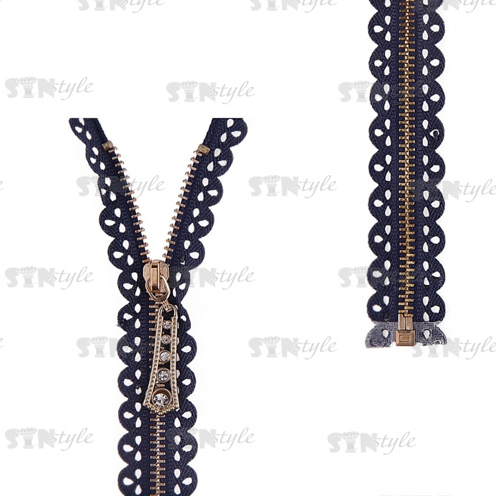 Молния металлическая, тип 3, разъемная, длина 60 см, цвет 330 (темно-синий), звенья золотистые, бегунок золотистого цвета со стразами