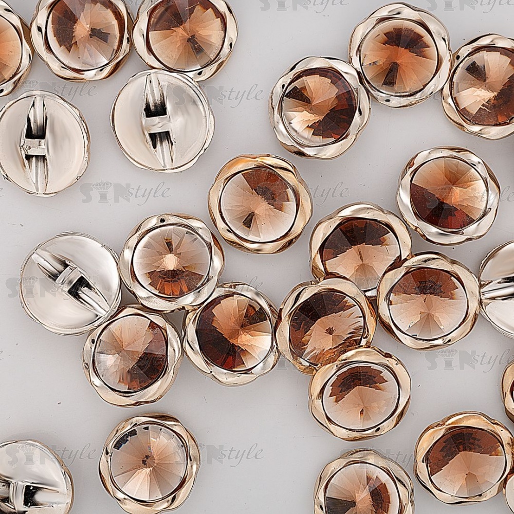 Пуговица пластиковая на полуножке, размер 28L, основа золотого цвета в форме цветка, шляпка конусовидной формы бежевая прозрачная