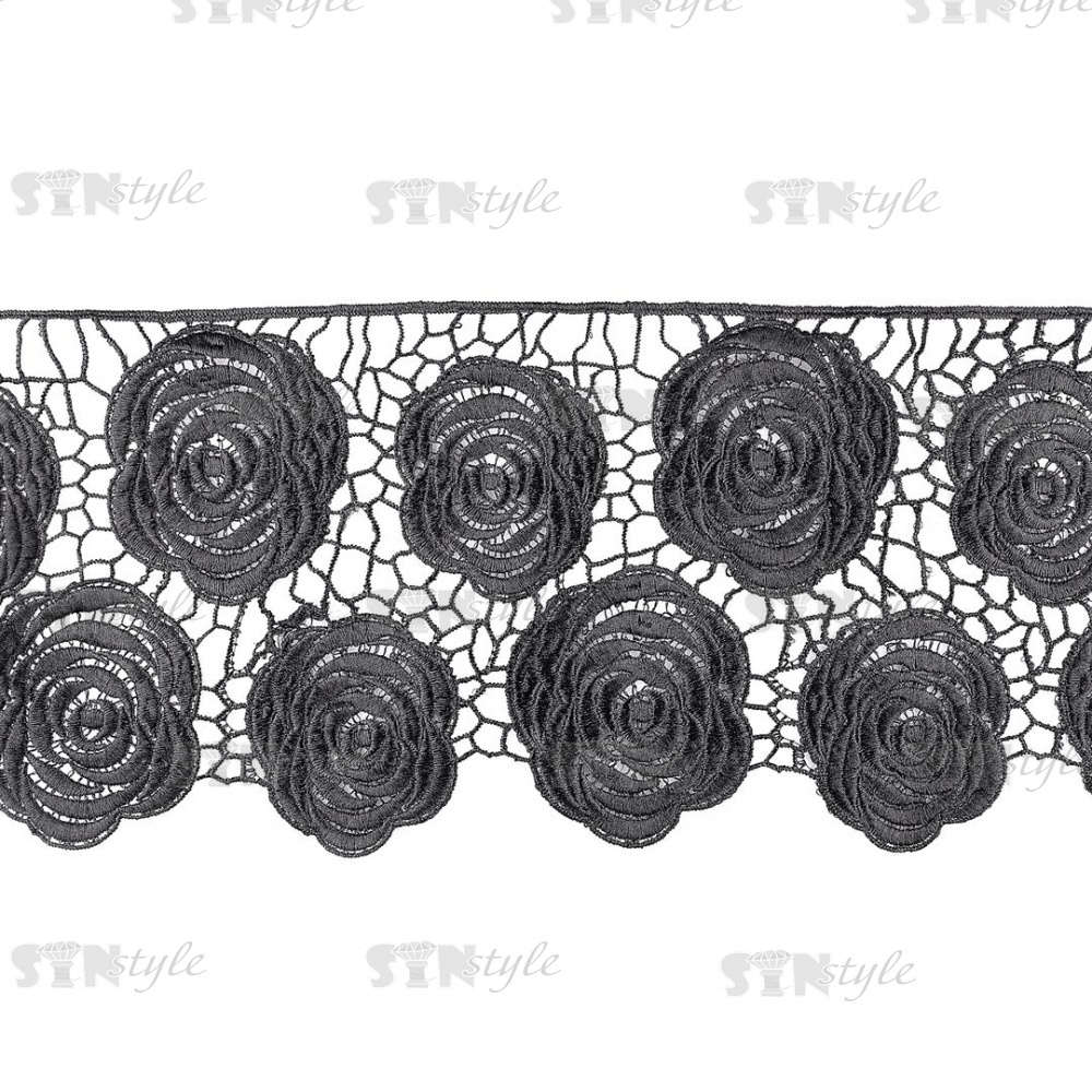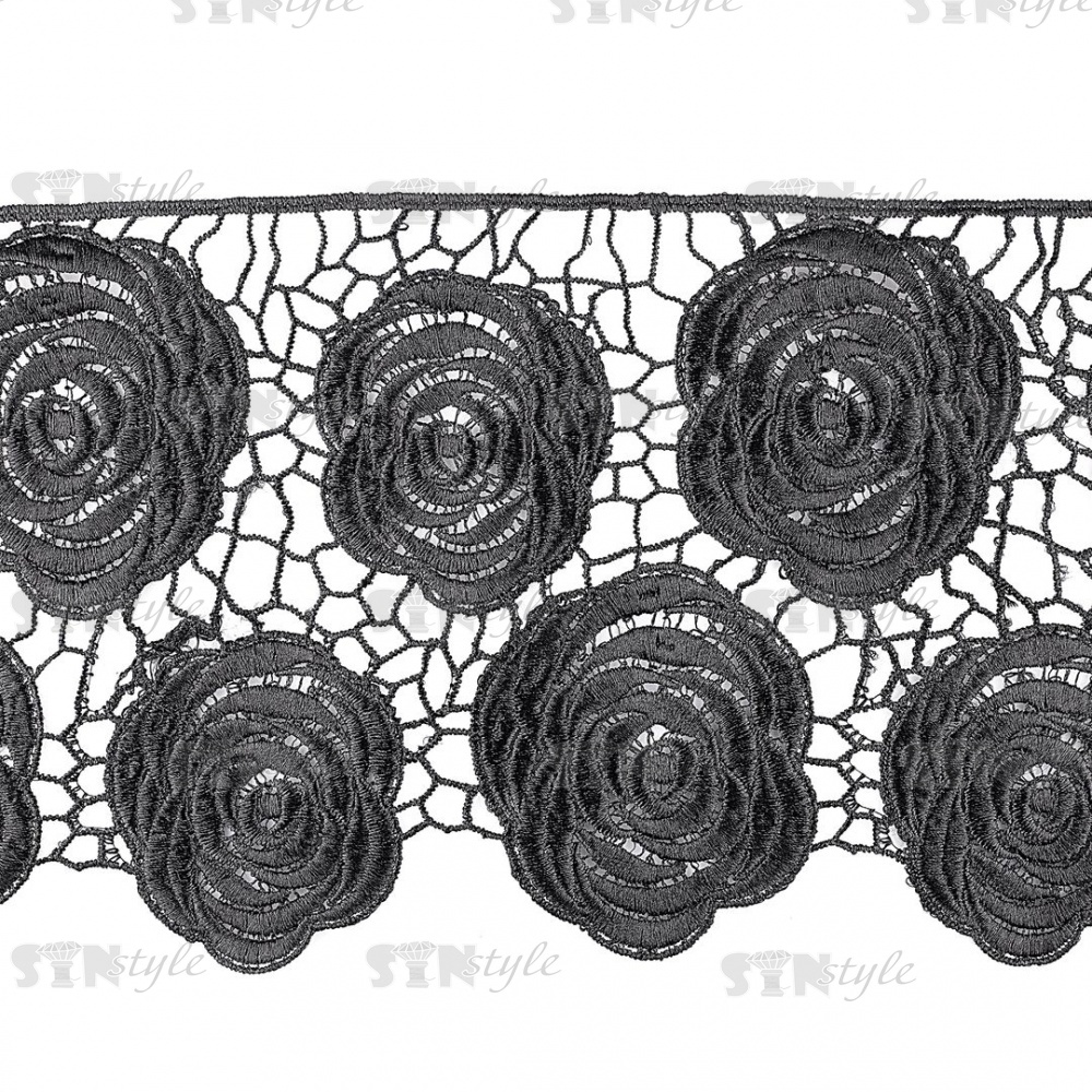 Кружево ажурное, оригинальная объемная гирлянда с крупными цветами, ширина 210 мм, цвет черный, намотка 15 ярдов