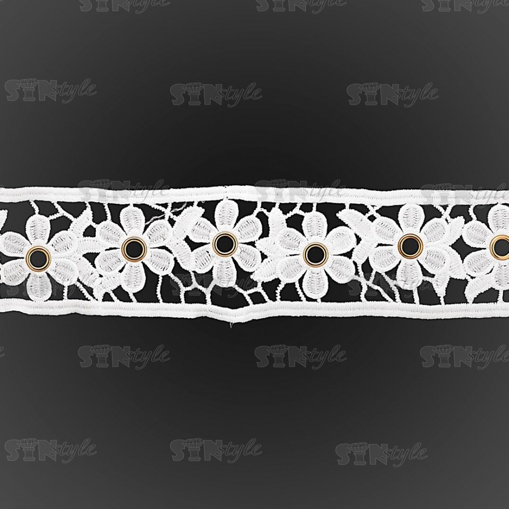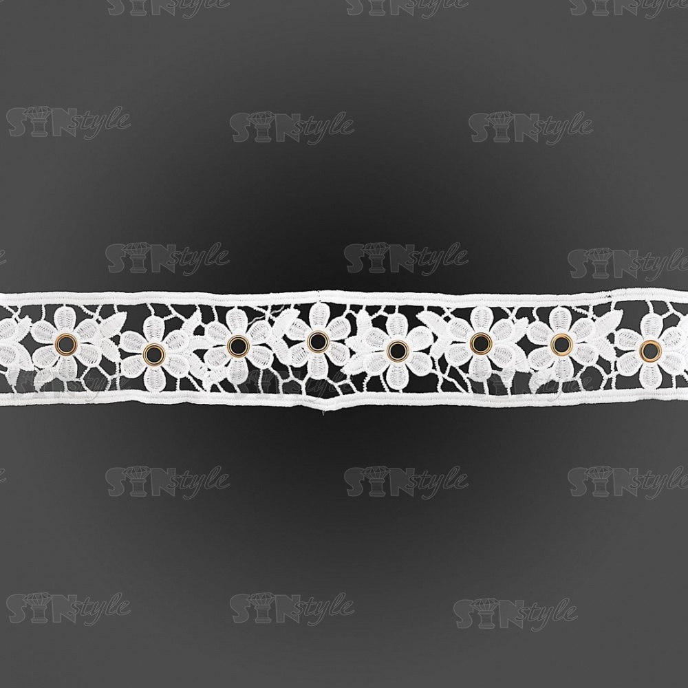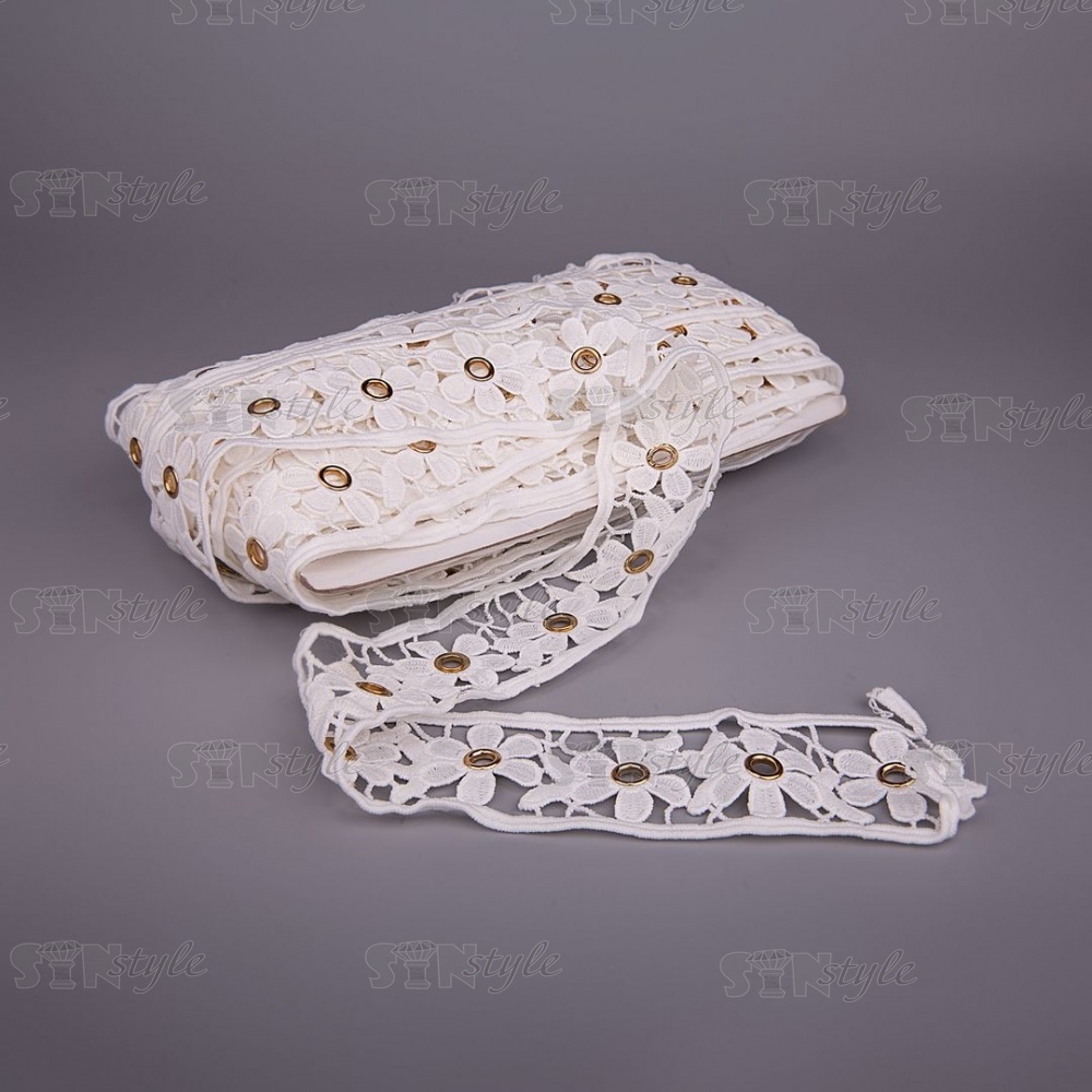 Кружево ажурное с отделкой, нежная кружевная цветочная гирлянда с люверсами в ценре каждого цветочка, ширина 50 мм, намотка 15 ярдов, цвет белый
