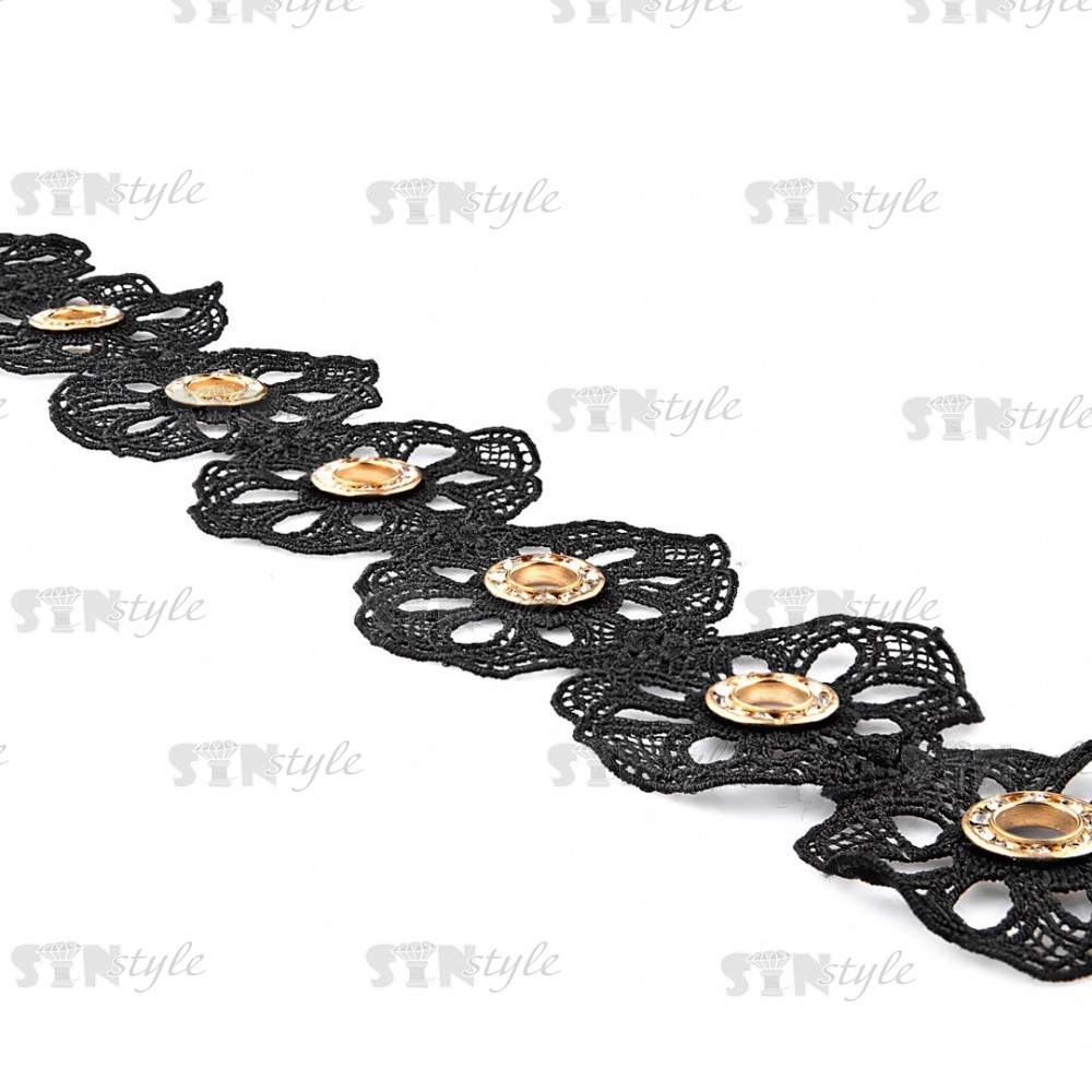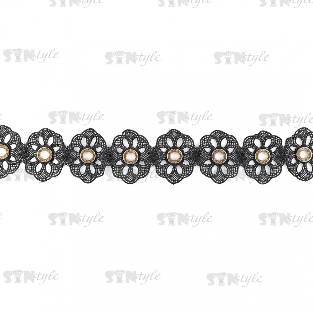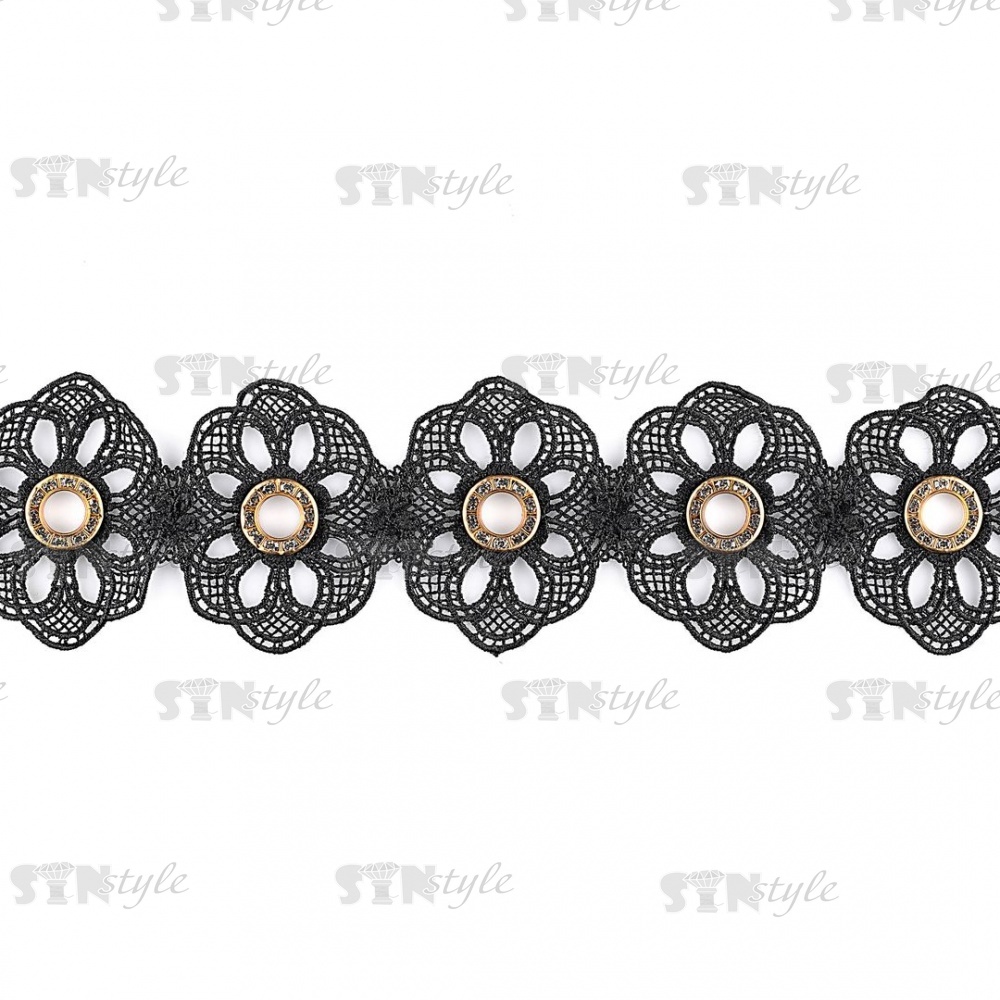 Кружево ажурное с цветочным орнаментом, украшенное золотыми люверсами и белыми стразами, ширина 60 мм, намотка 15 ярдов, цвет черный