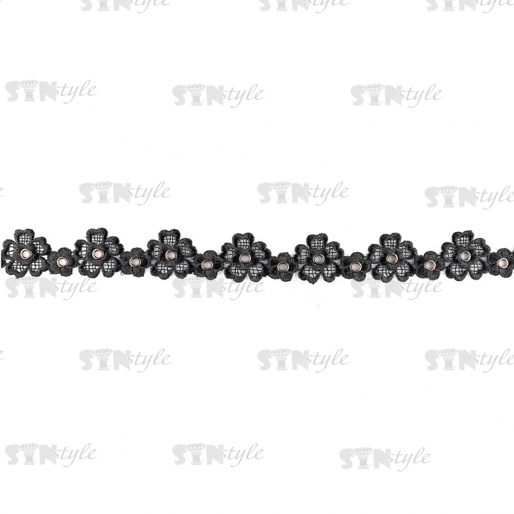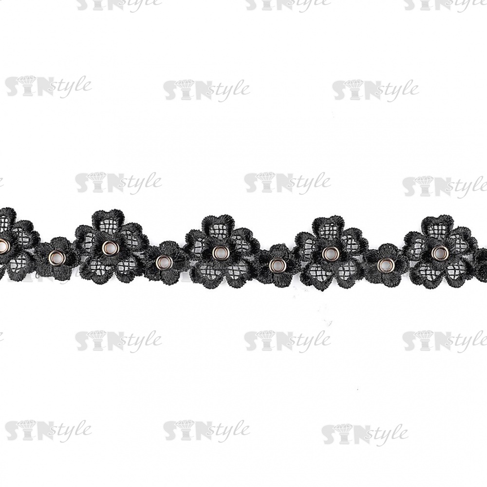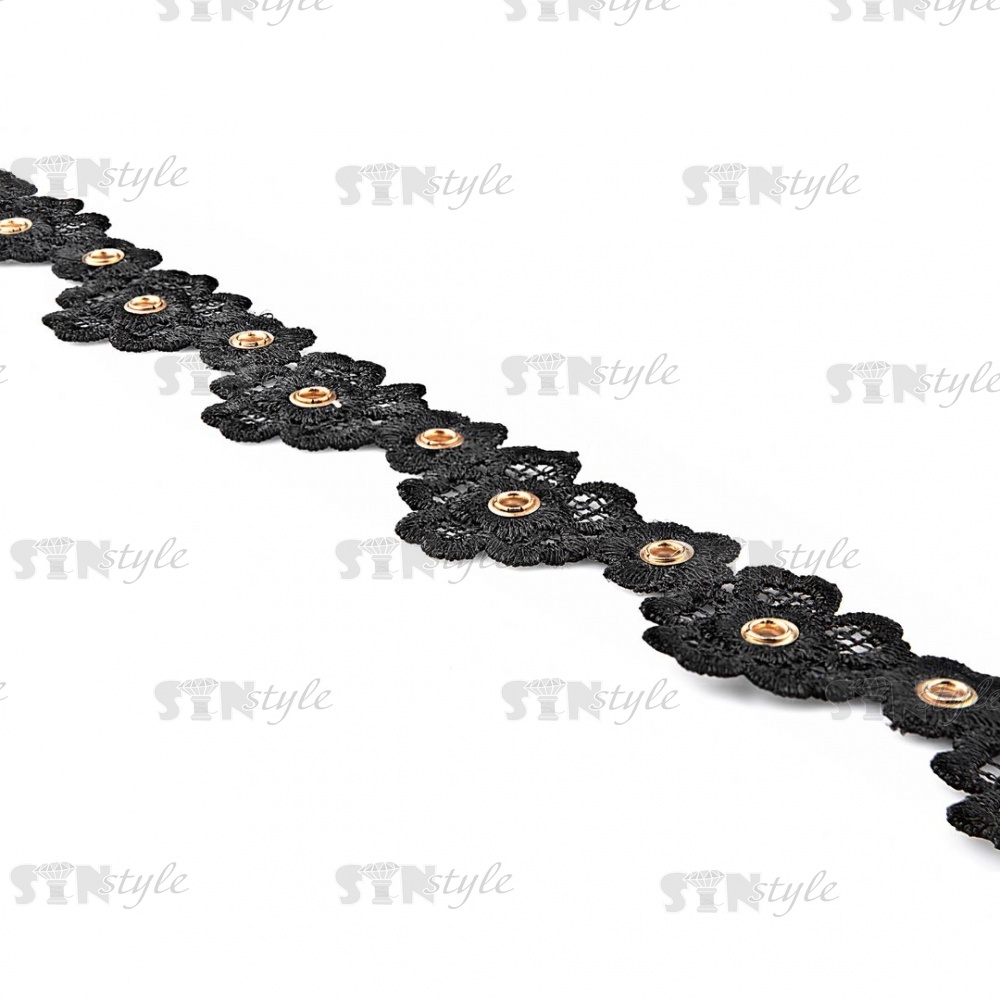 Кружево ажурное с цветочным узором, украшено золотыми люверсами в центре каждого цветка, ширина 35 мм, намотка 15 ярдов, цвет черный