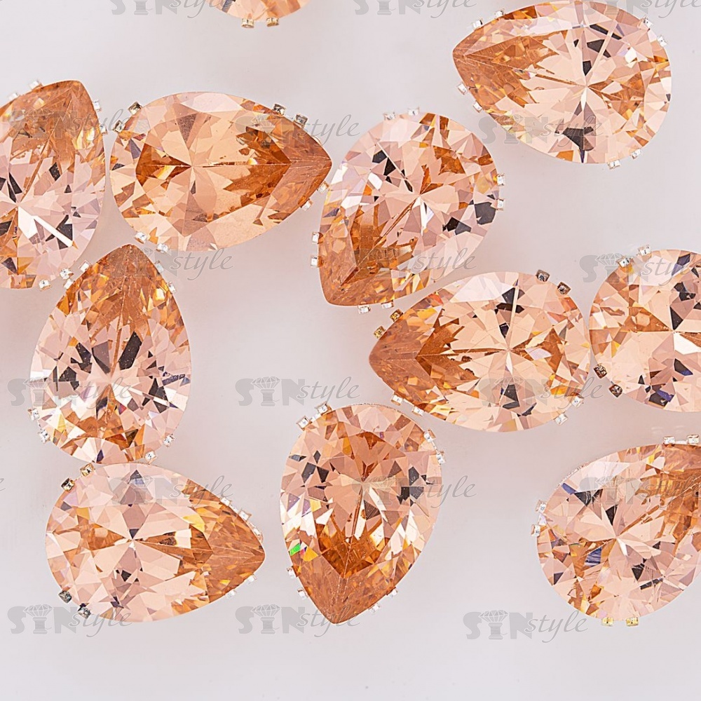 Стразы пришивные стеклянные в цапах, форма капля, цвет золото+персик, размер 9*14 мм