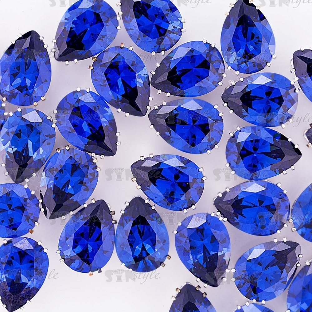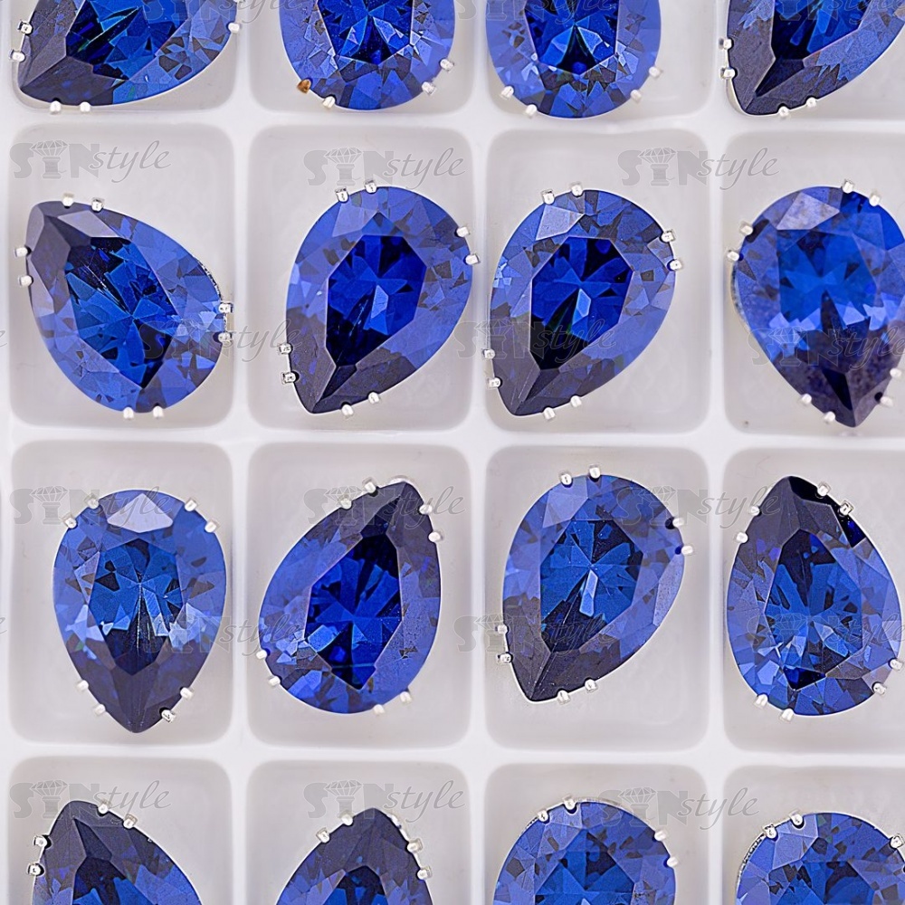 Стразы пришивные стеклянные в цапах, форма капля, цвет серебро+синий, размер 9*14мм