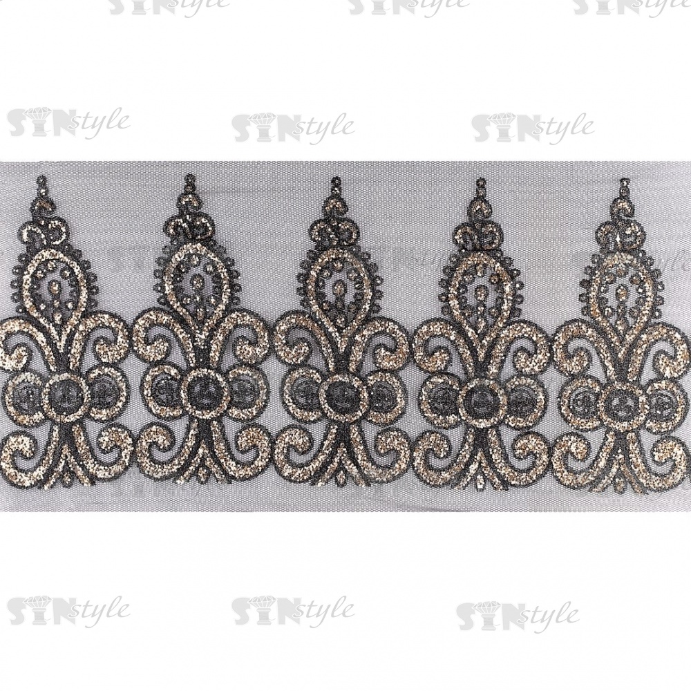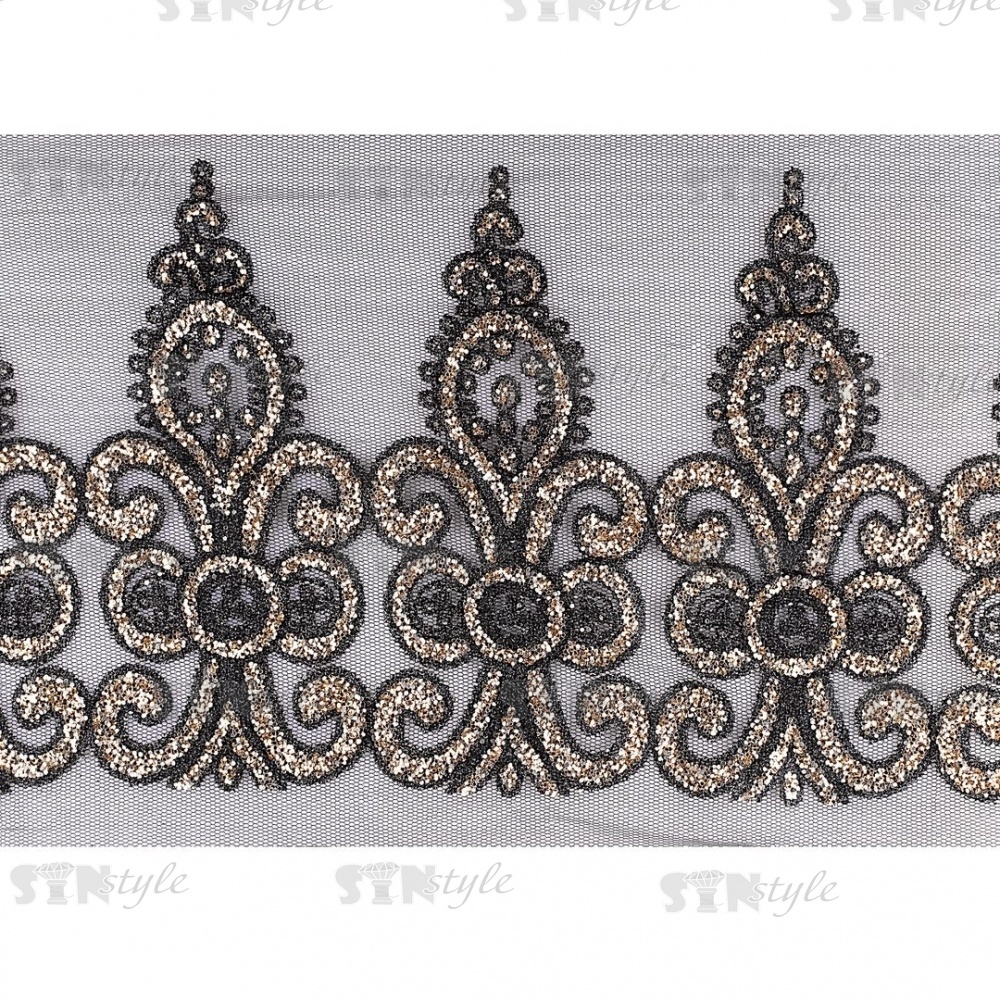 Кружево на черной сетке с золотым и черным глиттером, ширина 175 мм, намотка 15 ярдов