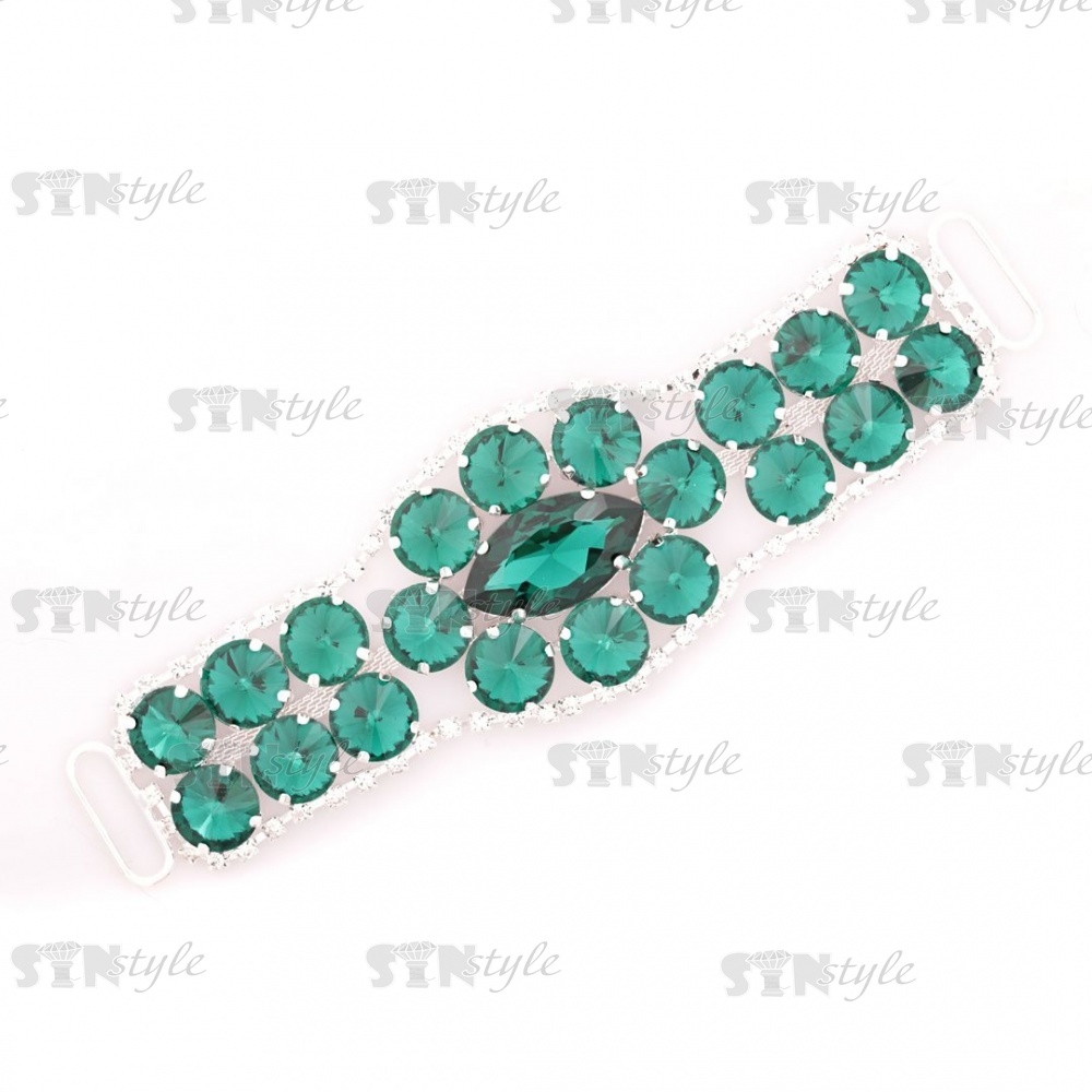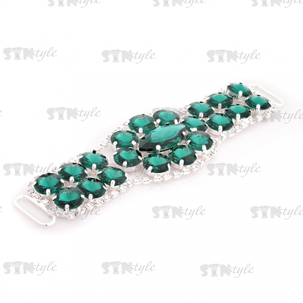 Декоративное украшение пришивное металлическое, цвет никель+зеленые стразы, размер 160*50 мм