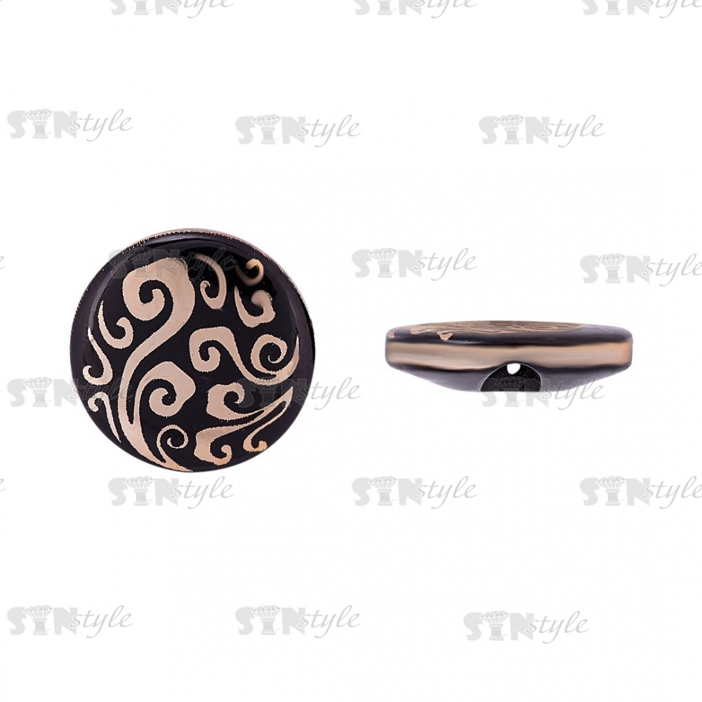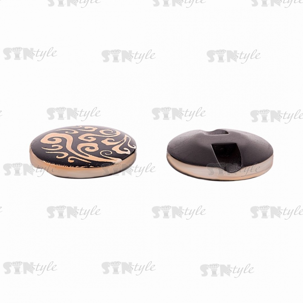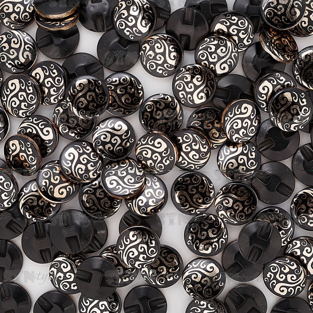 Пуговица пластиковая на полуножке, размер 28L, черная основа с золотым орнаментом