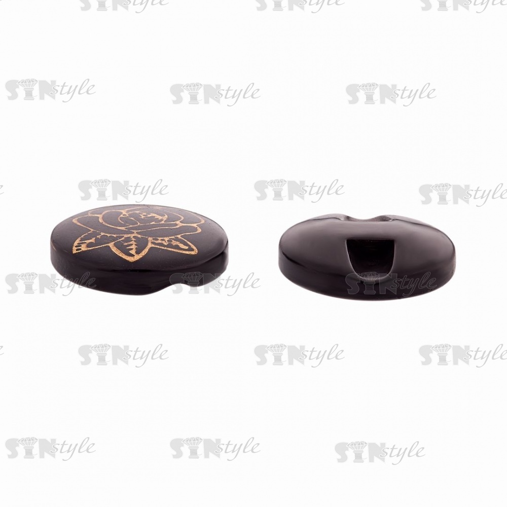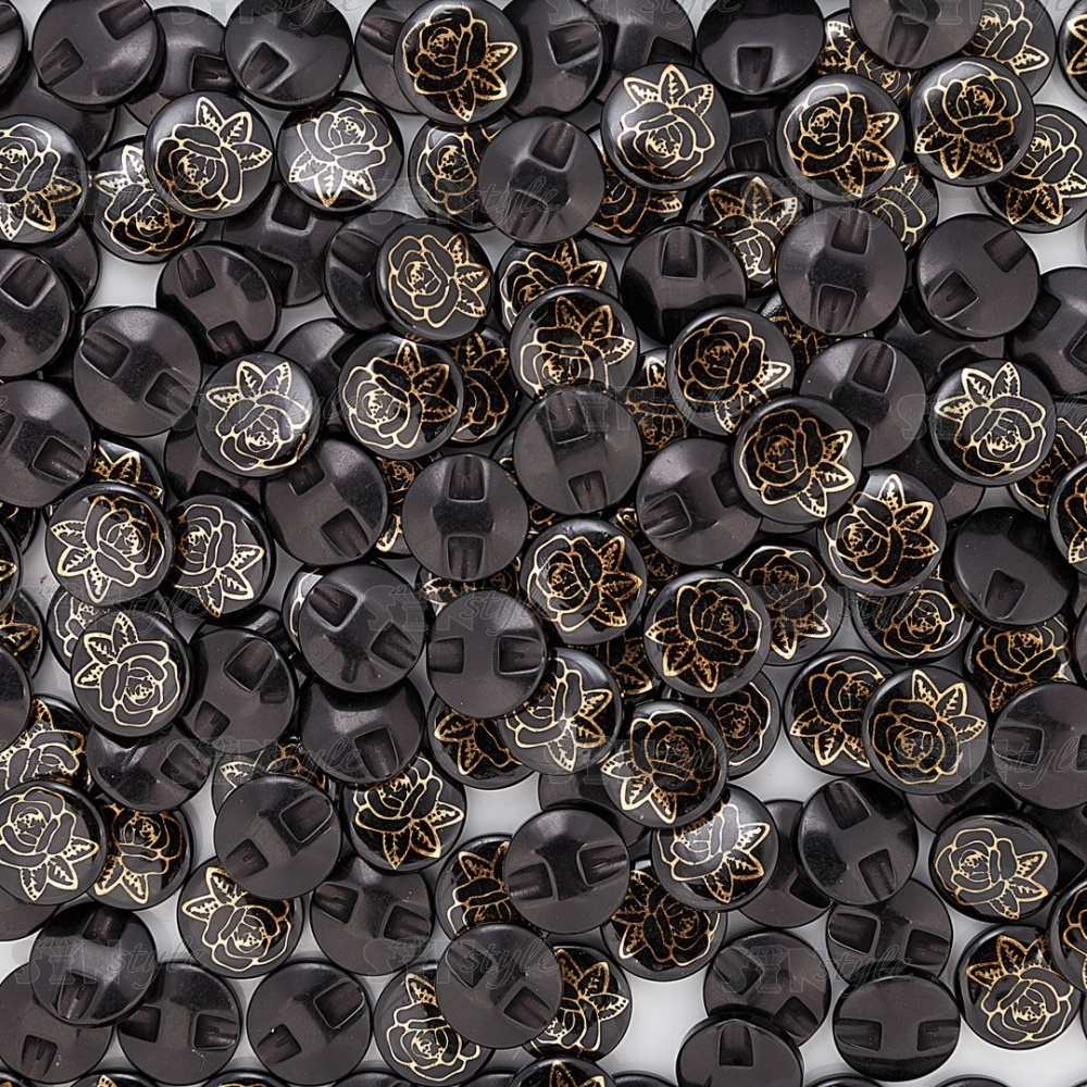 Пуговица пластиковая на полуножке, размер 20L, цвет черный, на шляпке золотой принт в виде розы