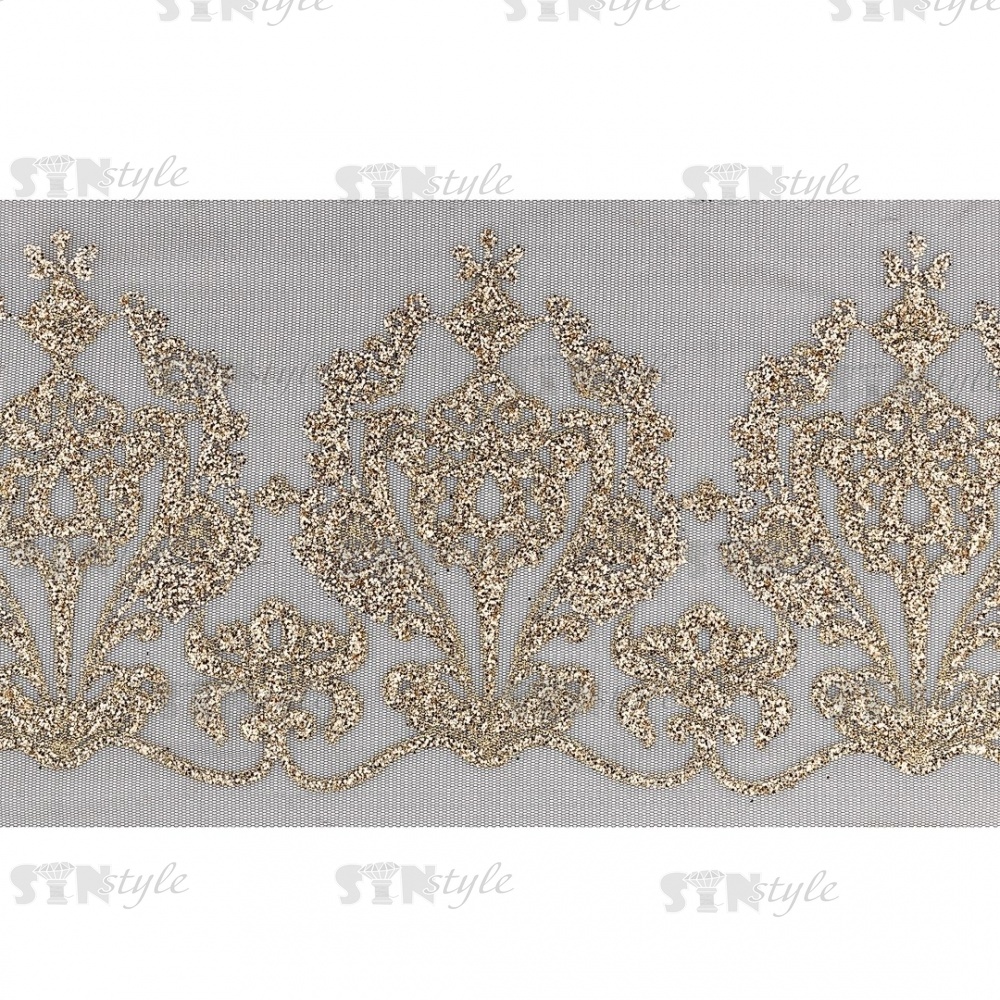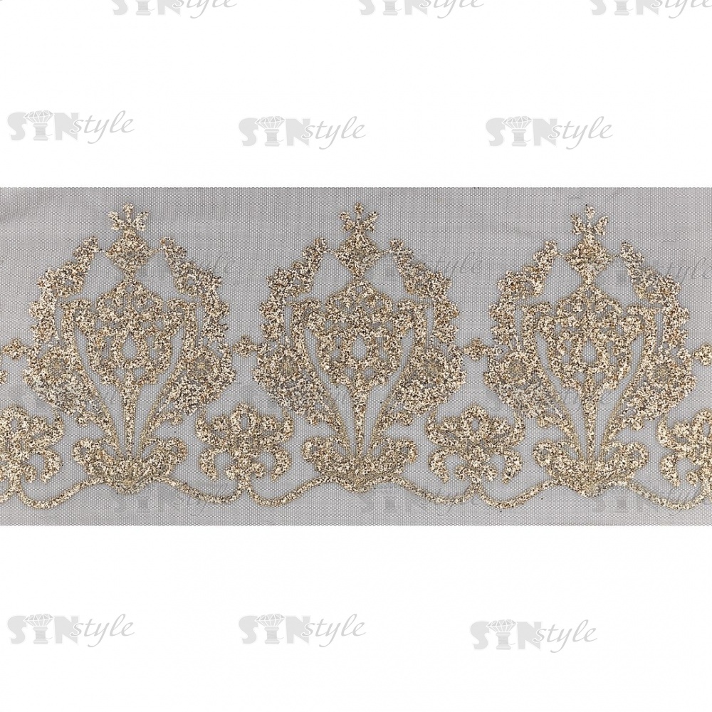 Кружево на сетке черного цвета с золотым глиттером, ширина 190 мм, намотка 15 ярдов