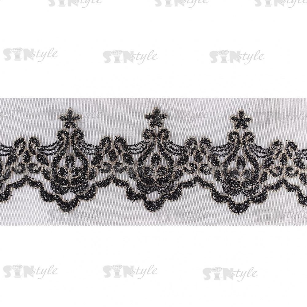 Кружево на черной сетке с золотым и черным глиттером, ширина 90 мм, намотка 15 ярдов