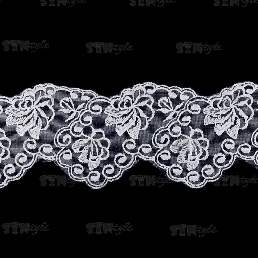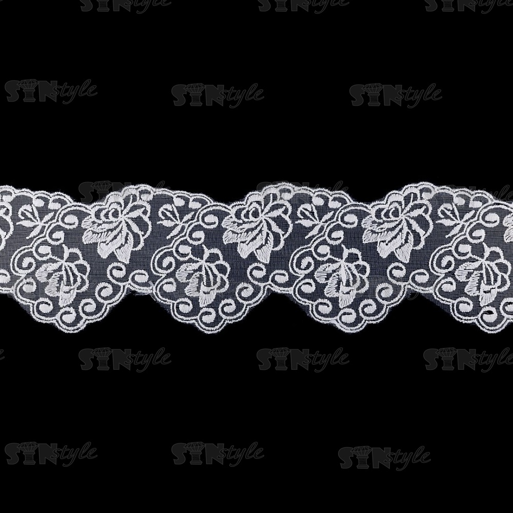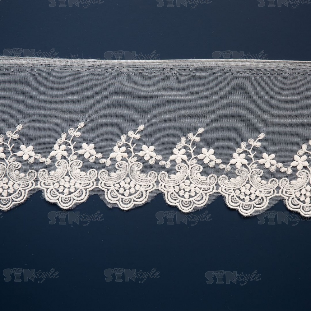 Кружево на сетке белого цвета с белой вышивкой, ширина 75 мм, намотка 15 ярдов