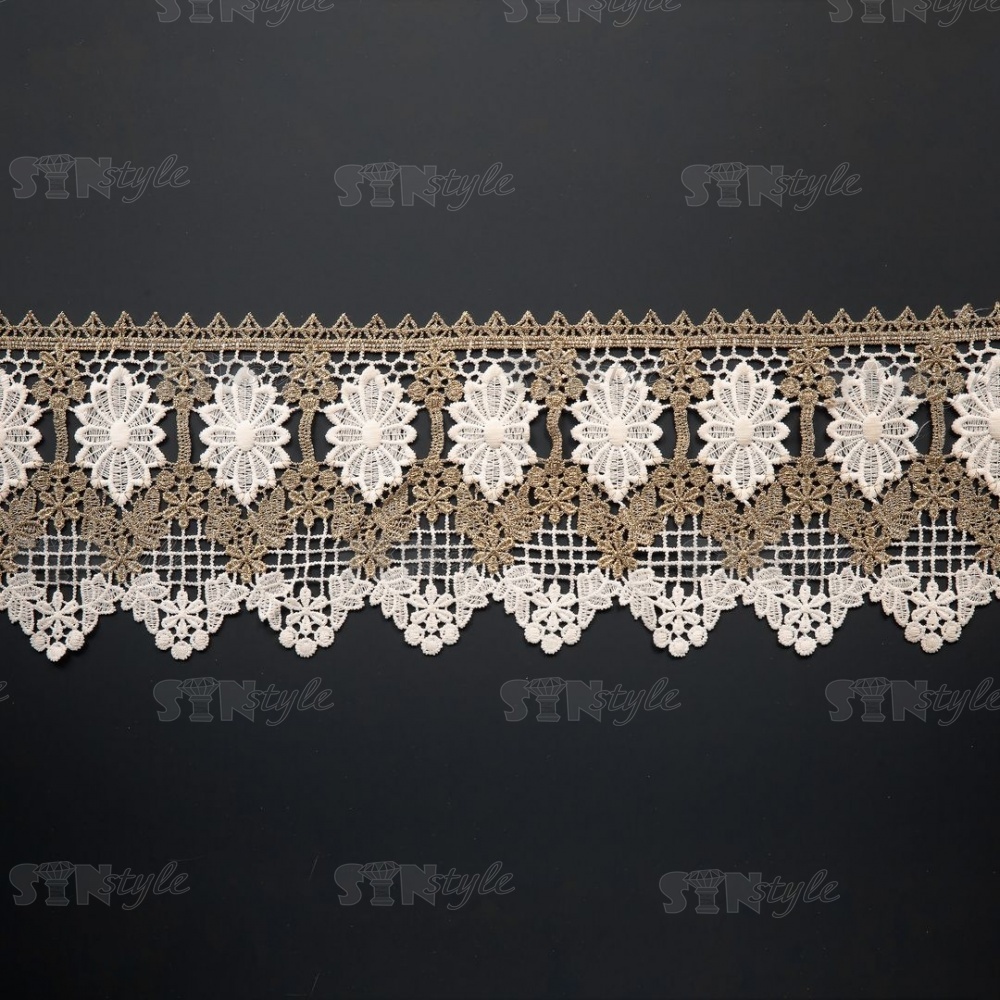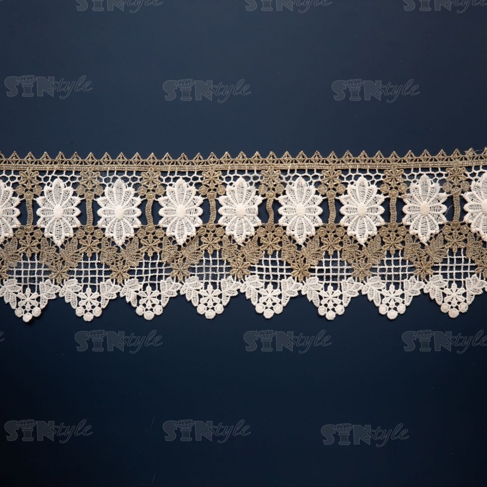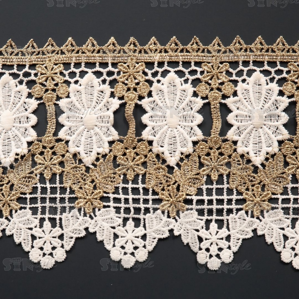 Кружево вязаное ажурное, цвет золотой с белым, намотка 15 ярдов, ширина 140 мм